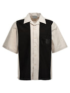 This distinctive piece features bold vertical color blocking in black and cream tones, creating that classic bowling shirt aesthetic. The shirt showcases logo prints at both the front and back, a functional chest pocket, and a full button closure down the front.