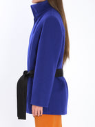 Short coat in ultramarine wool. Features a stand collar, oversized structured shoulders, concealed front button closure, two welt pockets at the front, and a removable contrast silk belt tied at the waist. Silk twill lining. Regular fit.