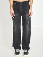 Black denim cotton jeans with Max Black wash. It features belt loops, button closure at the front, five pockets, a leather Celine Paris patch at the back, mid-rise waist, straight leg. Vintage effect. Regular fit.