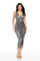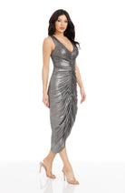 The Britt Dress is a versatile and stylish choice for any occasion. With its sleeveless design and V-neckline, this dress flatters the body while the ruched details add an elegant touch. The tea length hemline adds a classic and timeless look to this dress.