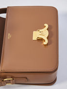 Elevate your everyday style with the Celine Teen Triomphe Shoulder Bag in sophisticated bronze calf leather. This iconic design features the signature Triomphe buckle closure in gleaming golden-toned hardware, making it an instantly recognizable statement piece.