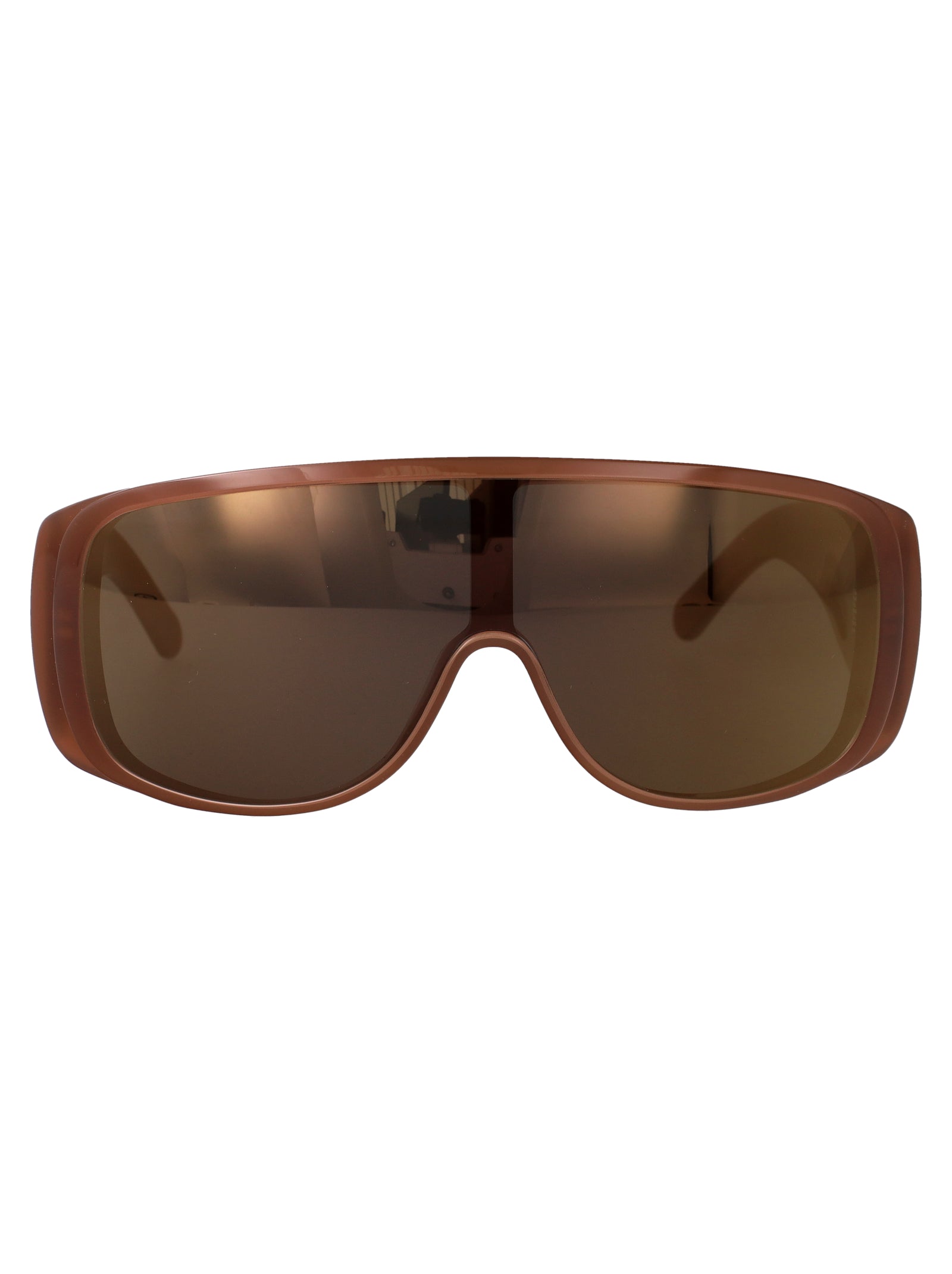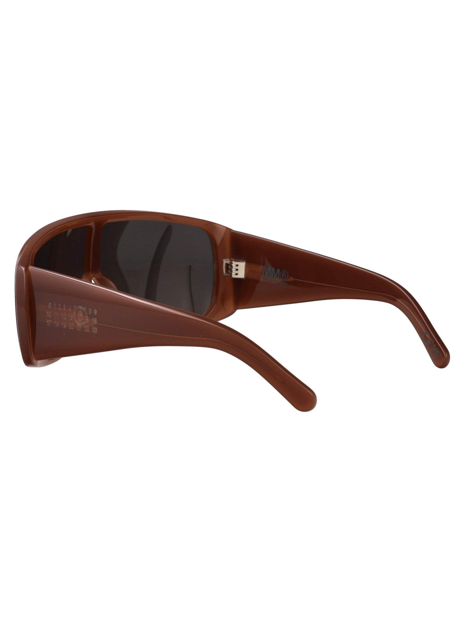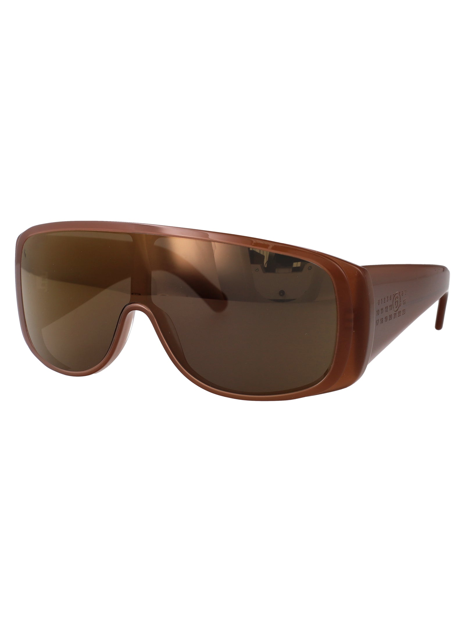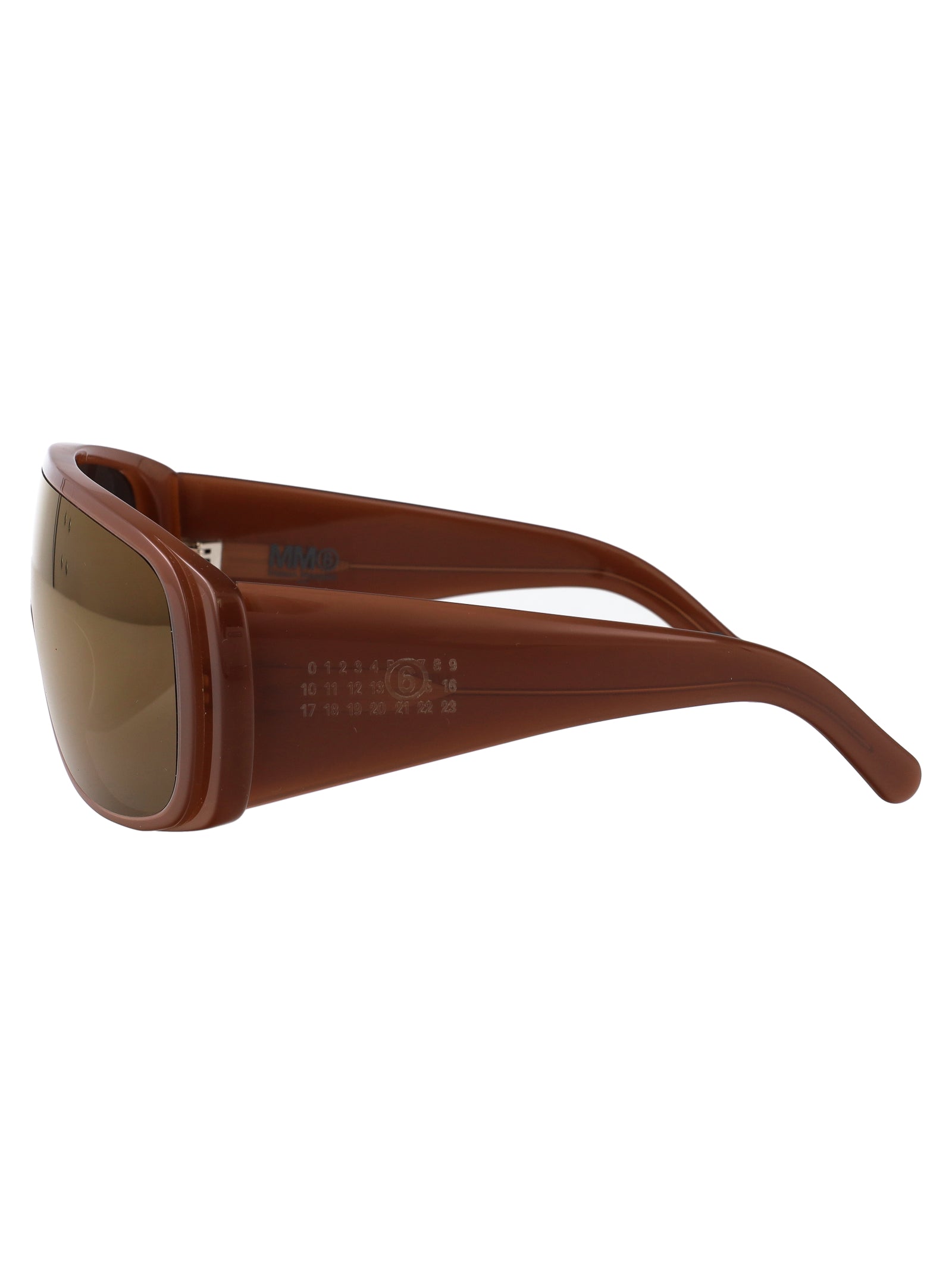 Make a bold statement with these striking brown acetate sunglasses from Maison Margiela. Featuring a modern geometric shield design with a wraparound silhouette, these sunglasses offer both fashion-forward style and superior sun protection.