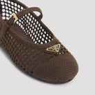 Elevate your everyday elegance with these exquisite Prada Brown Cotton Ballerinas. Crafted from beautifully crocheted brown cotton, these ballet flats feature a sophisticated round toe design and luxurious gold-toned hardware, including the iconic enamelled triangle logo.