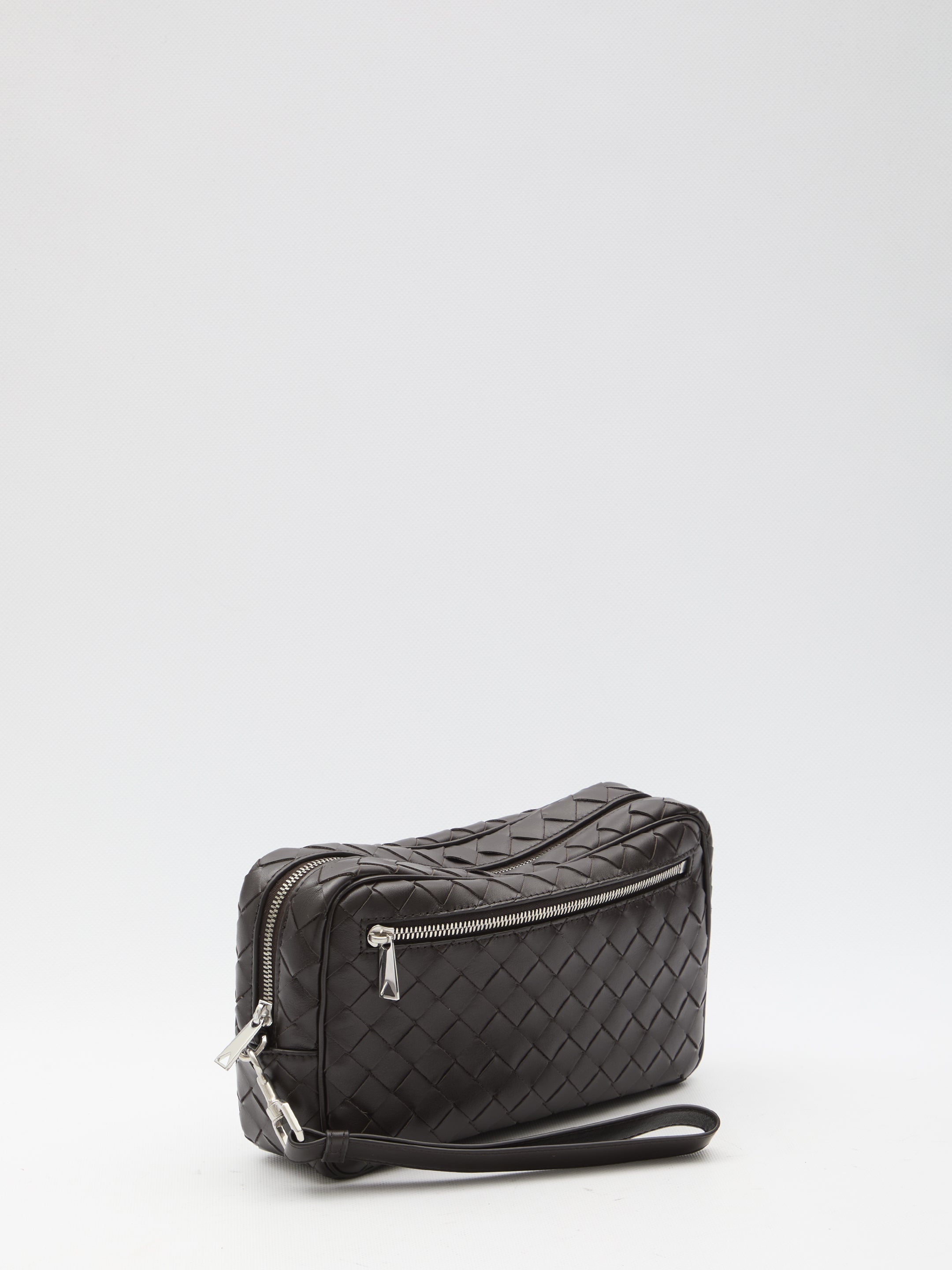 Brown calfskin pouch with all-over Intrecciato motif. It features detachable wrist strap, one front zip pocket, zip closure, one main interior compartment, one interior flat pocket and six interior card slots. Any leather imperfections are not to be considered manufacturing defects, but a peculiarity of the material.