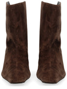 Elevate your footwear collection with these luxurious brown leather booties from Khaite. Crafted in Italia from premium suede with a sleek pointed toe and sophisticated kitten heel, these ankle boots effortlessly blend timeless elegance with modern minimalism.
