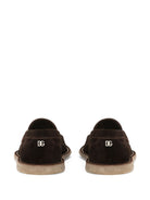 BROWN CALF SUEDE LOGO PLAQUE ALMOND TOE BRANDED LEATHER INSOLE FLAT RUBBER SOLE