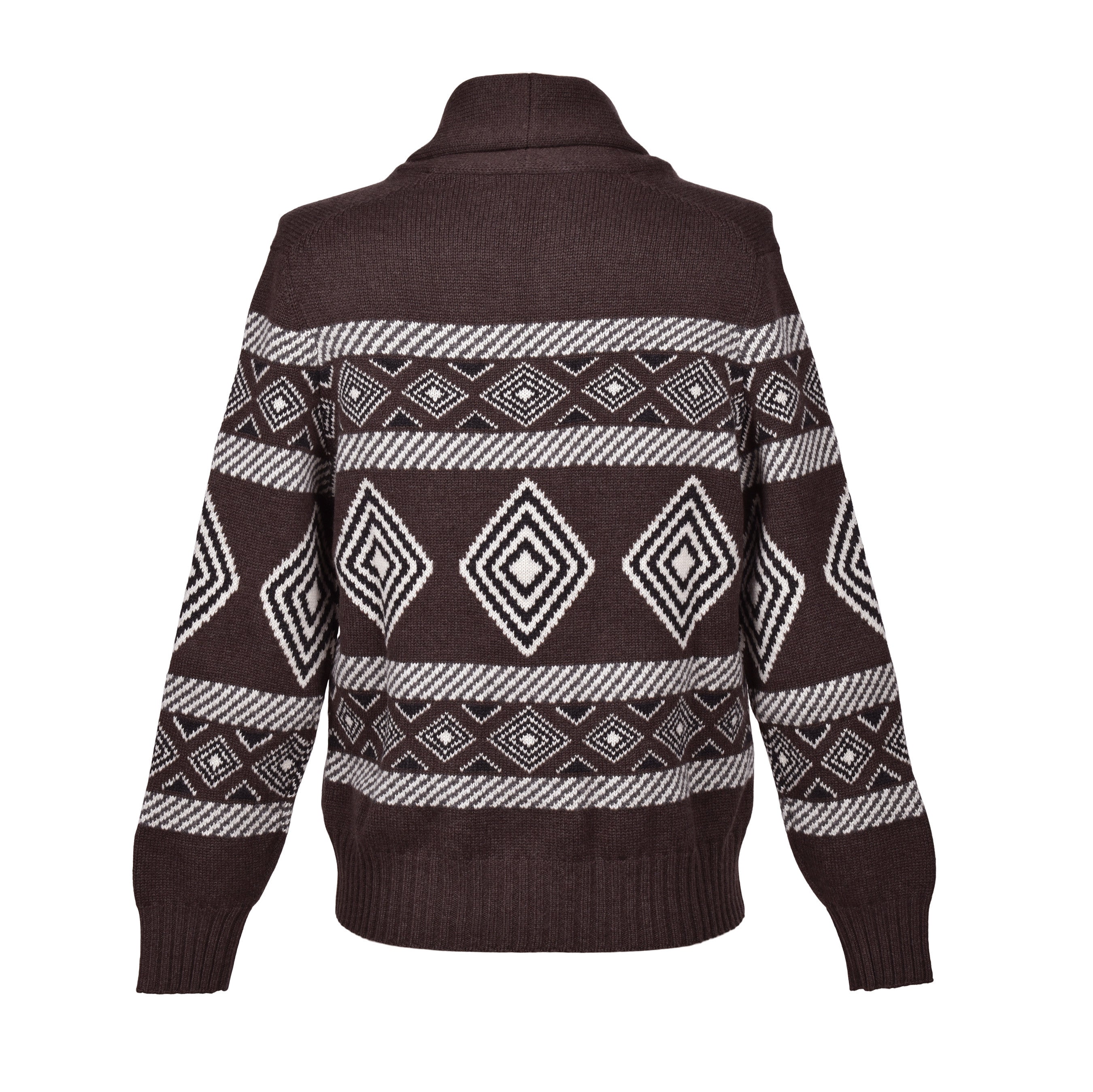 This sophisticated button-down cardigan features a striking geometric Fair Isle-inspired pattern in contrasting black and white, making it a versatile statement piece for your wardrobe. The classic shawl collar and ribbed trim details add timeless appeal, while the lightweight cashmere construction ensures comfort throughout the seasons.