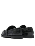 Elevate your everyday style with these luxurious brushed leather loafers from Miu Miu. Crafted from supple black leather with a sophisticated brushed finish, these classic loafers feature elegant metal hardware detailing that adds a touch of refinement.