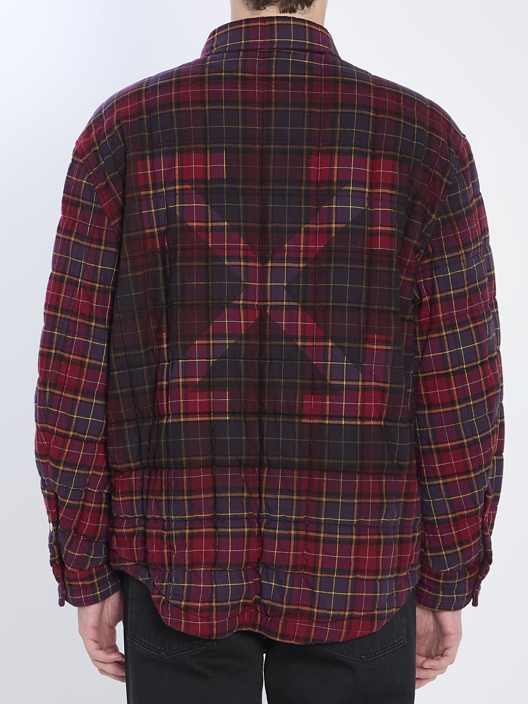 Burgundy cotton overshirt with all-over check pattern. Features a pointed collar, front pointed button closure, buttoned cuffs, Off-White embroidered signature on the chest, printed logo on the back, and rounded hem. Lined breathable model. Oversized fit. The model is 189 cm tall and wears size 52 IT.