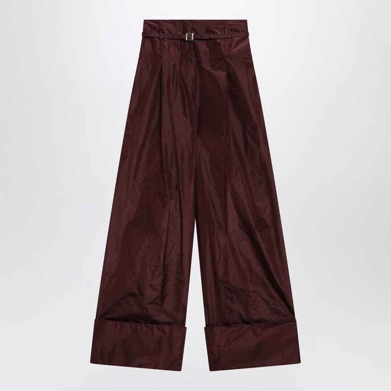 Elevate your wardrobe with these stunning Burgundy Taffeta Pants from Fendi. Crafted from luxurious silk taffeta, these wide-leg trousers feature a sophisticated high-waisted silhouette with an elegant belted detail and refined cuffed hems.