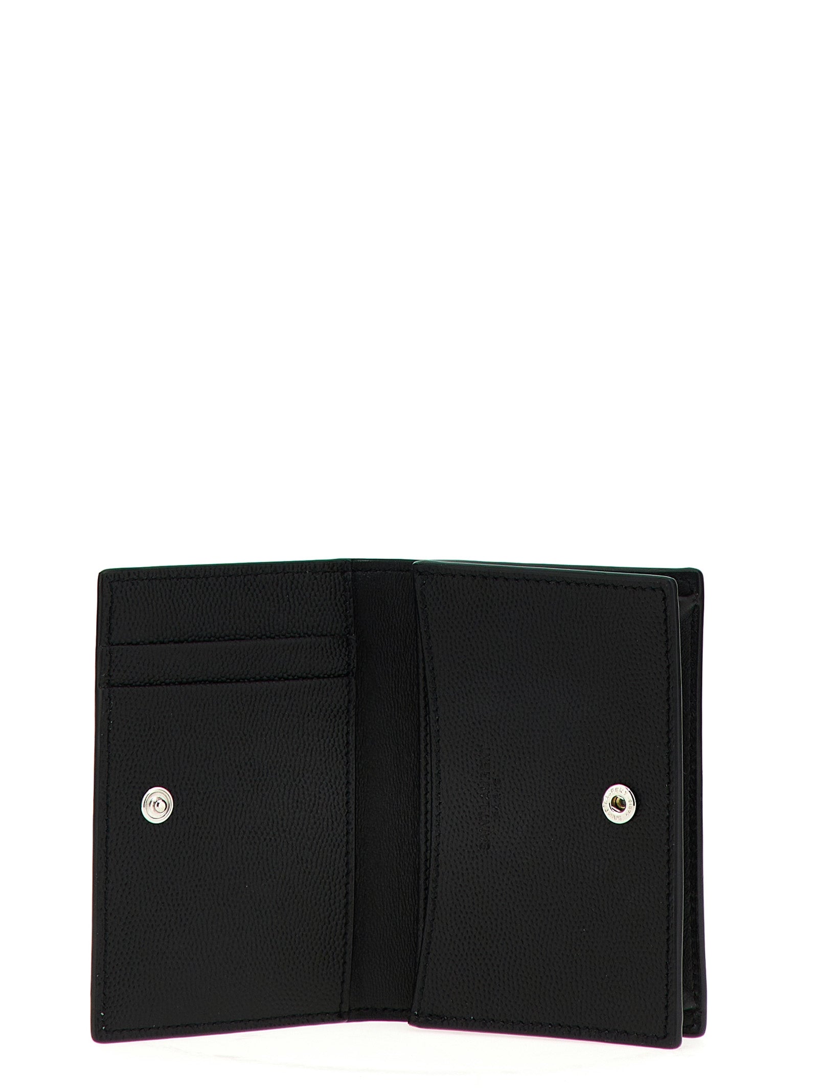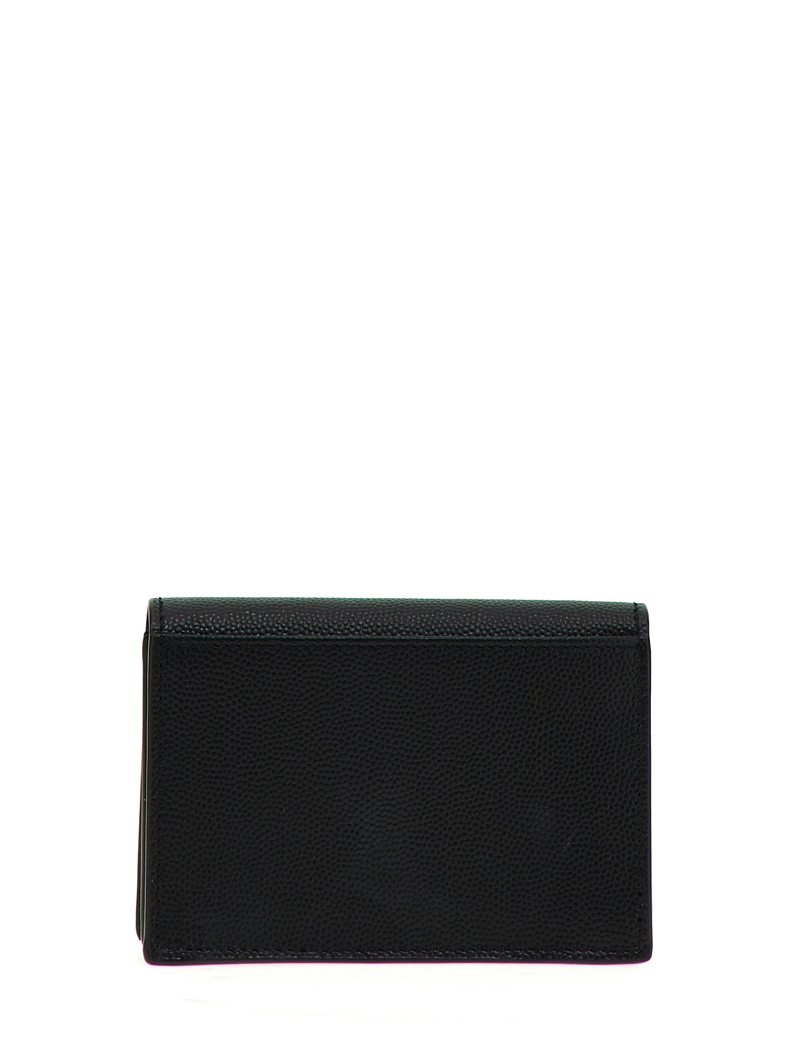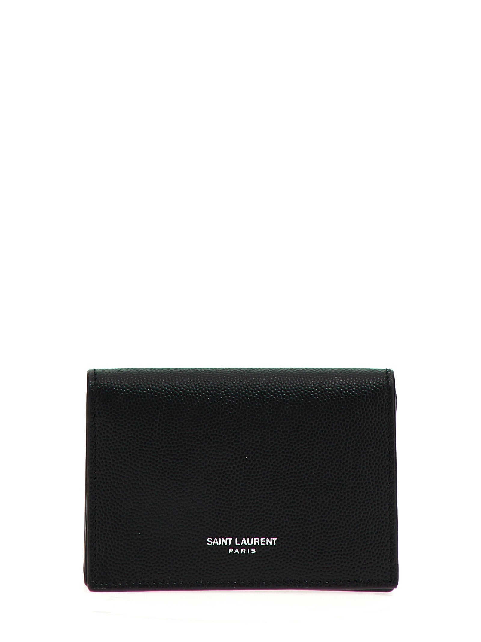 The Saint Laurent 'Paris' business card holder is a sophisticated essential for the modern professional. Crafted from luxurious grain de poudre leather, this sleek accessory features a secure button closure and an embossed logo on the front that speaks to refined taste.