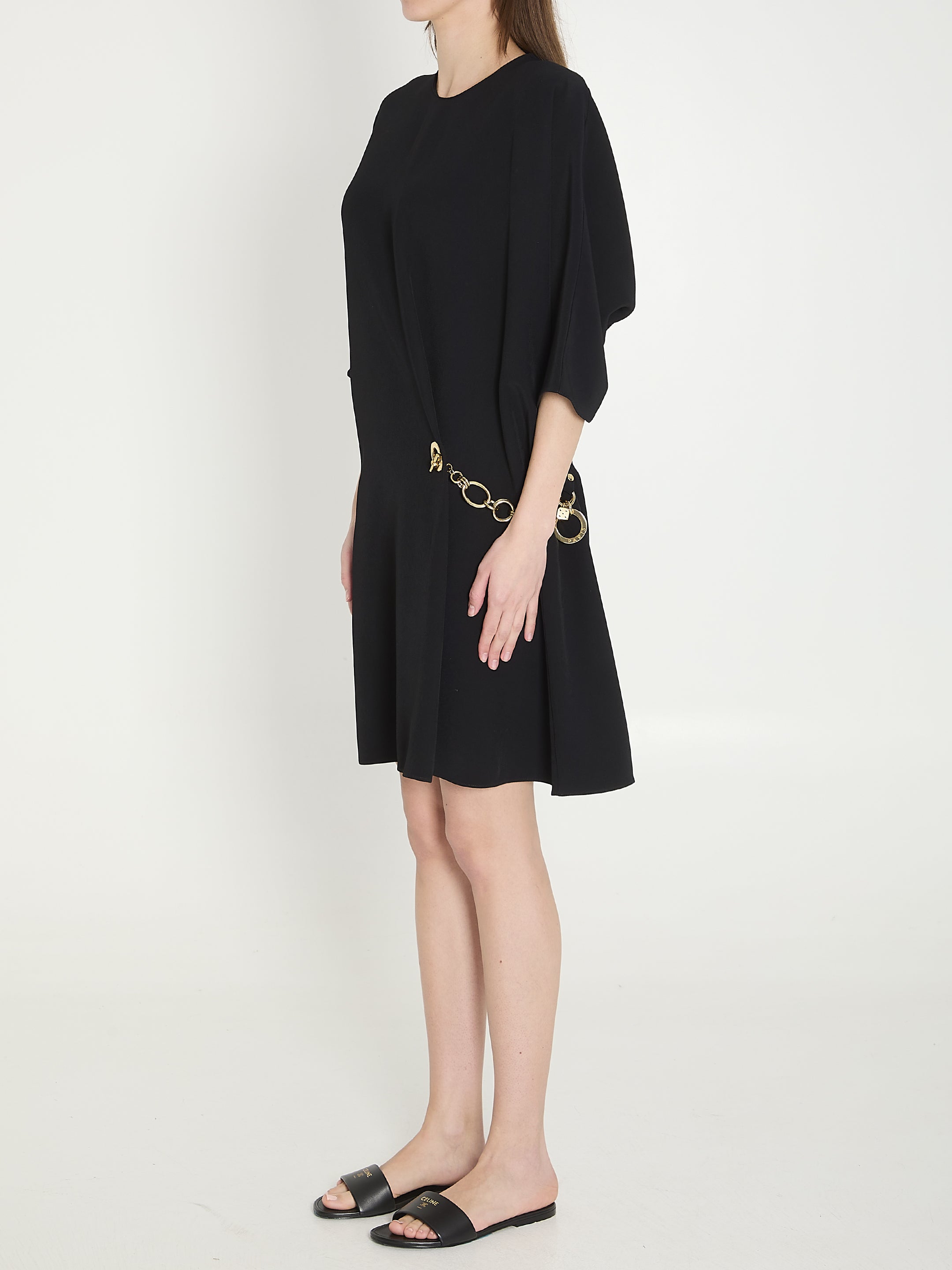 Black viscose cady mini dress featuring a crew neck, wide short sleeves, gold metal chain with Celine Paris engraving, back button closure, and a small slit at the back. Comfortable fit.
