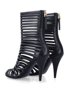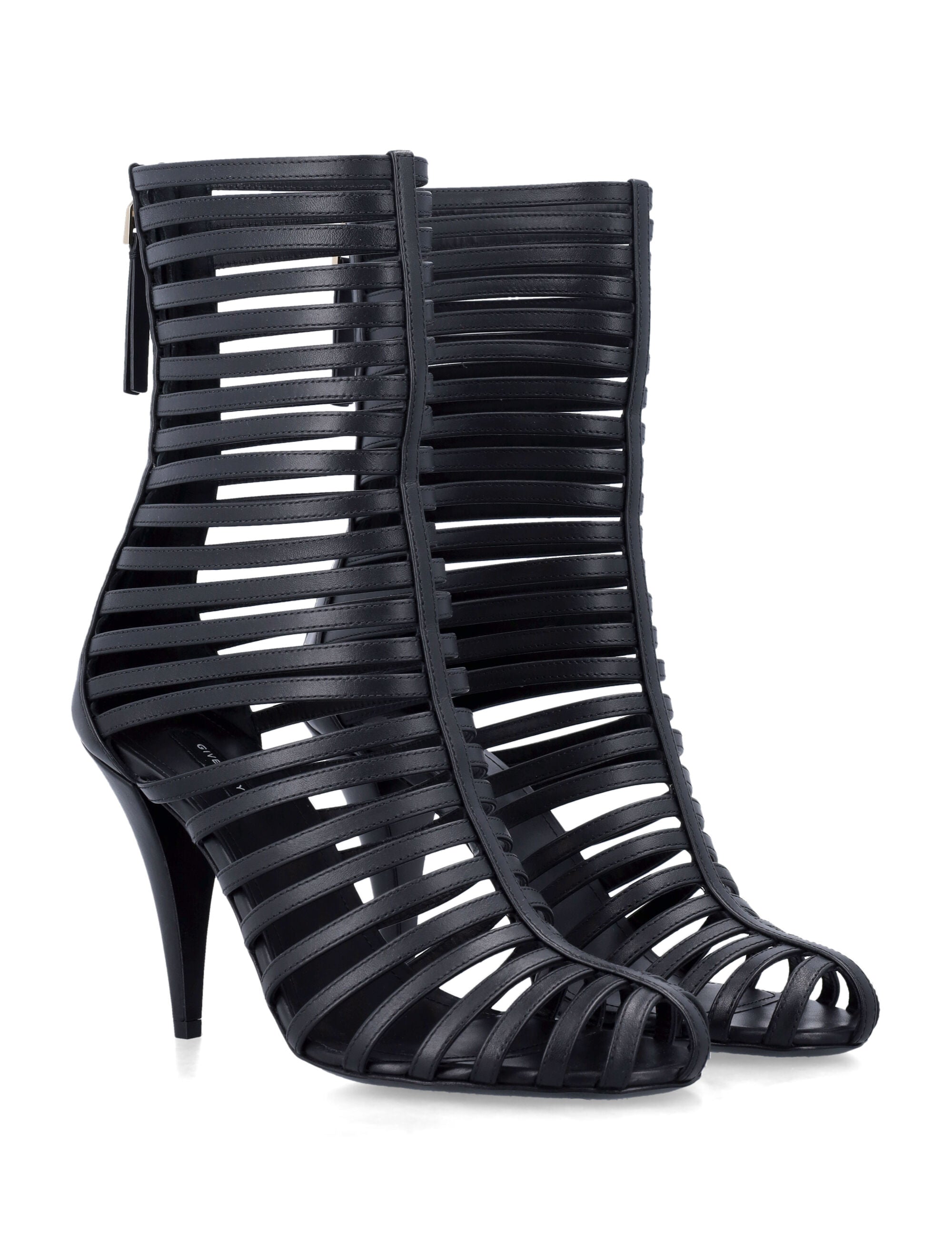 Make a bold statement with the Givenchy Cage Bootie, a stunning fusion of edgy design and sophisticated elegance. This striking ankle boot features dramatic horizontal leather straps that create a captivating cage effect, while the sleek stiletto heel adds height and allure.
