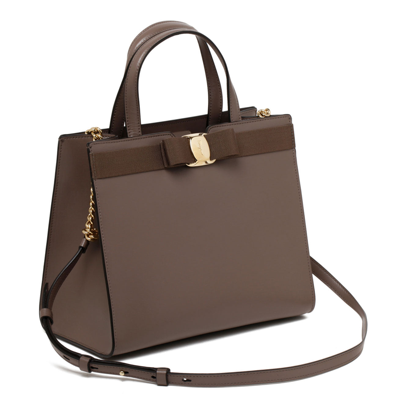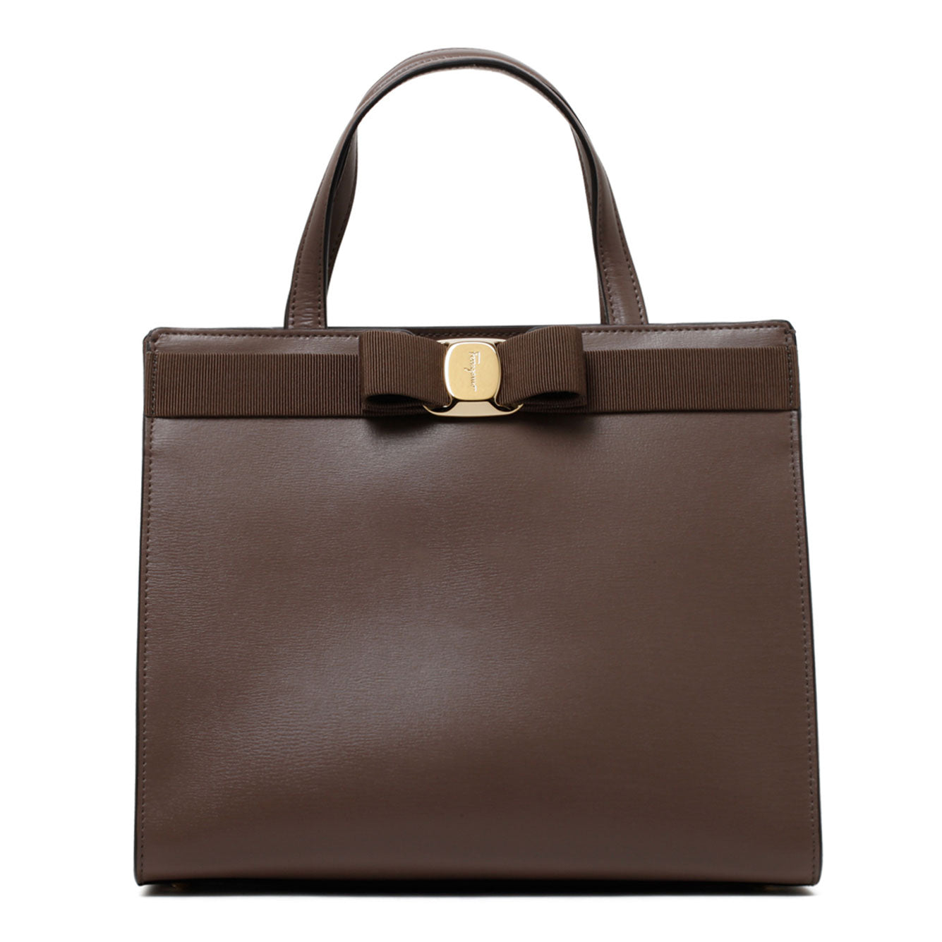 Elevate your everyday elegance with this exquisite Ferragamo satchel, crafted from luxurious calf leather and cotton. The structured silhouette features refined top handles and a signature bow detail adorned with gleaming gold-tone hardware, embodying the Italian house's timeless sophistication.