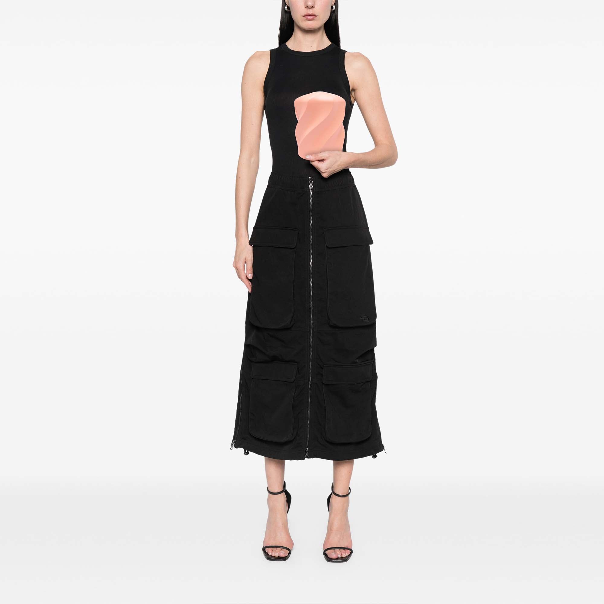 This exquisite clutch features a luxurious calfskin leather body with the signature sculptural whirl silhouette that makes it instantly recognizable. The top clasp closure ensures your essentials are secure while maintaining the bag's sleek, elegant lines.