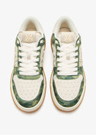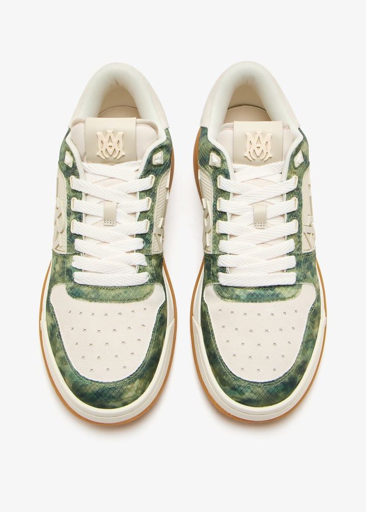 AMIRI presents the Camo Classic Low sneaker, a luxury take on streetwear style that seamlessly blends military-inspired aesthetics with contemporary design. This low-top silhouette features a distinctive green camouflage pattern contrasted with cream tones, while the signature "M" logo adorns the side panel for an unmistakable brand statement.