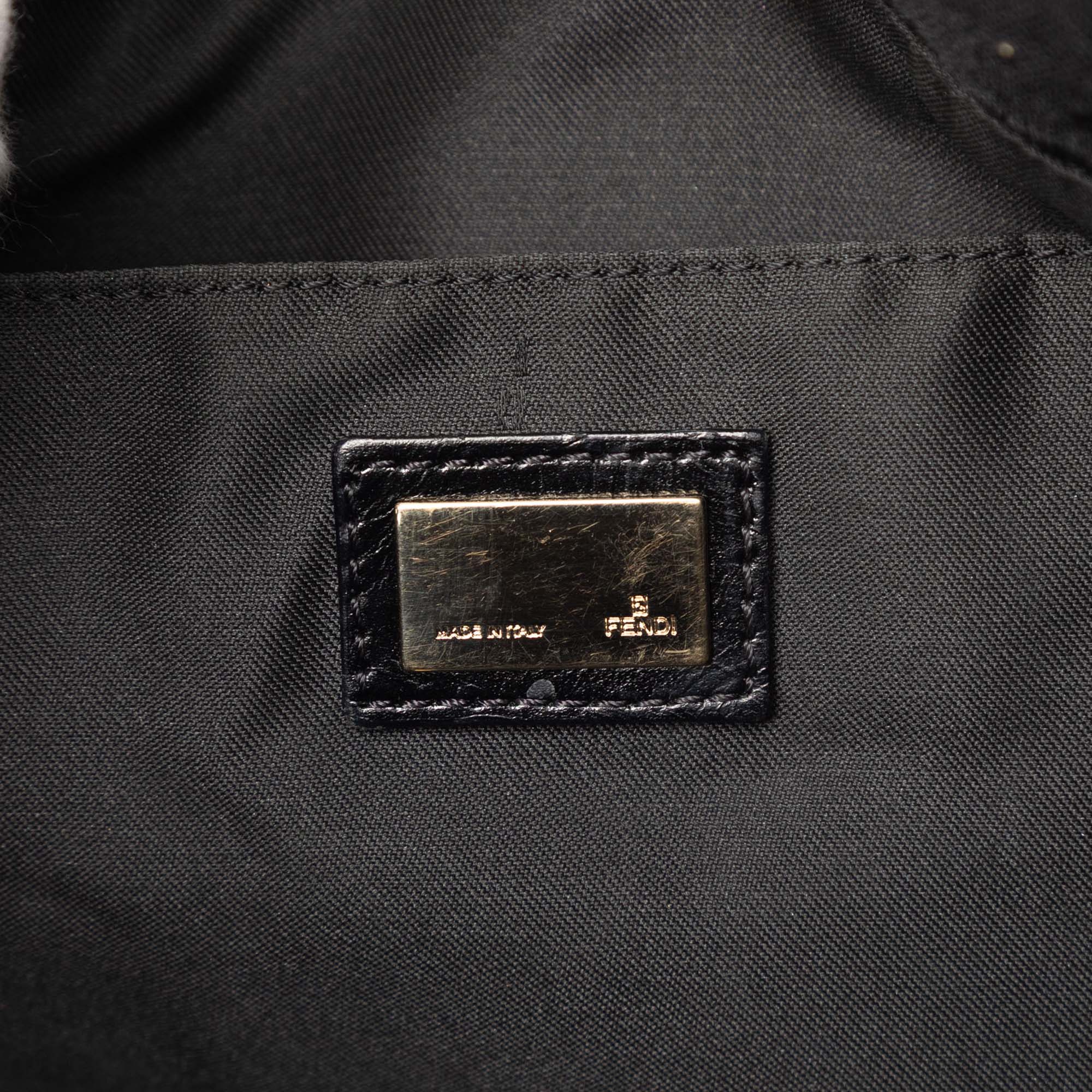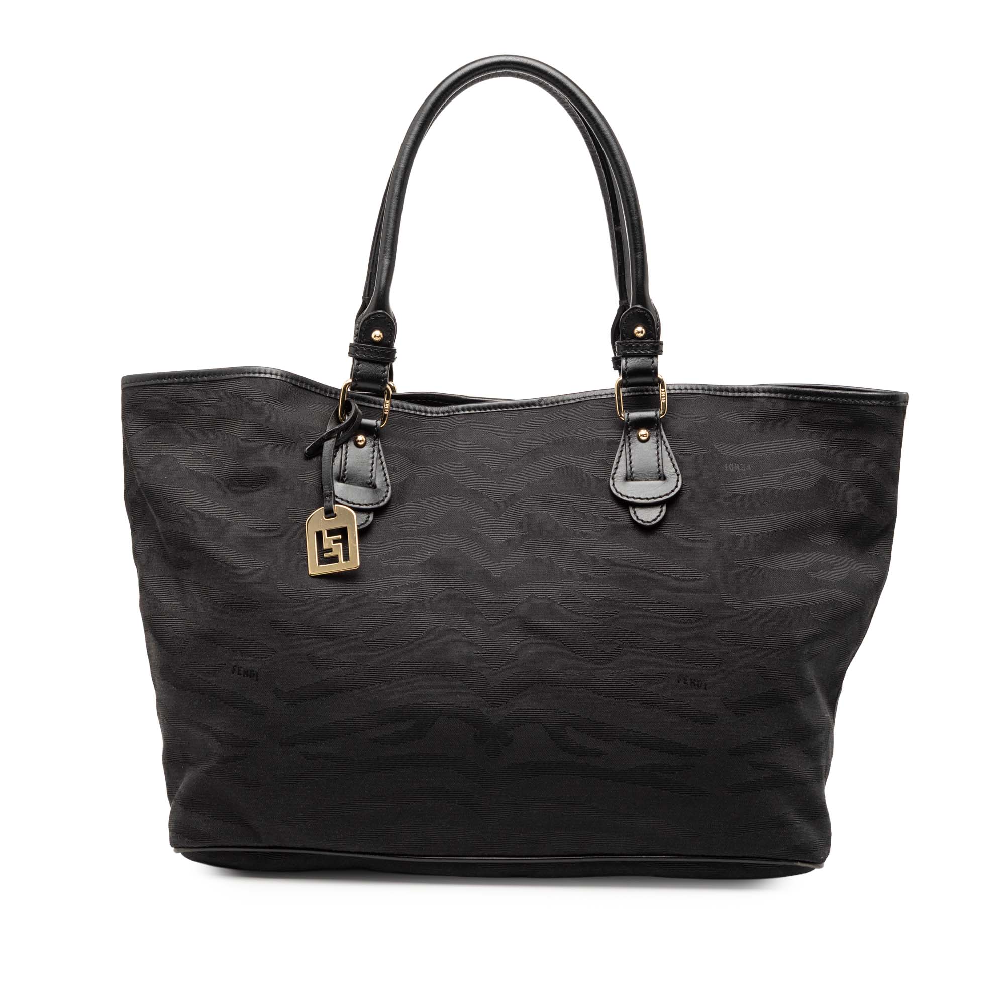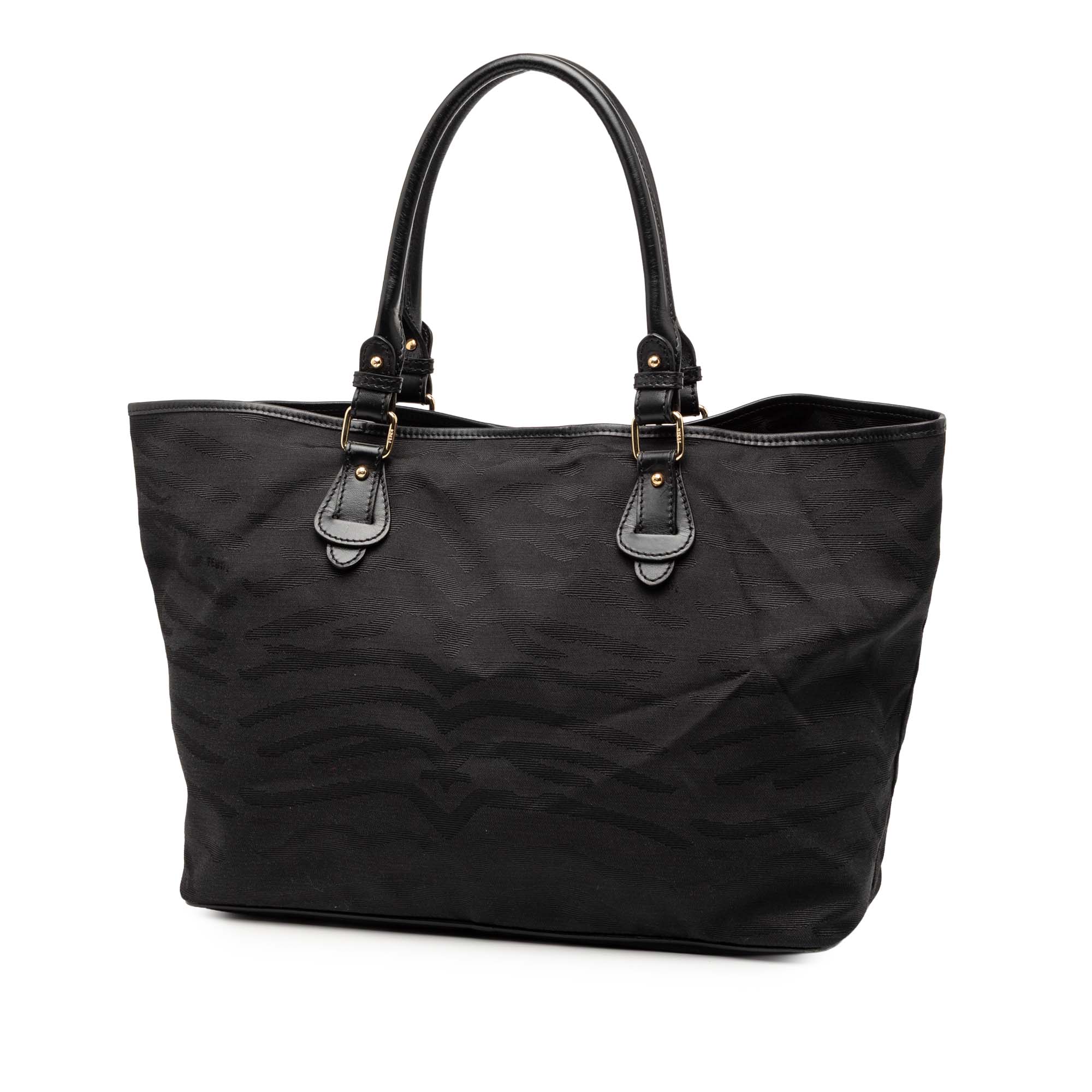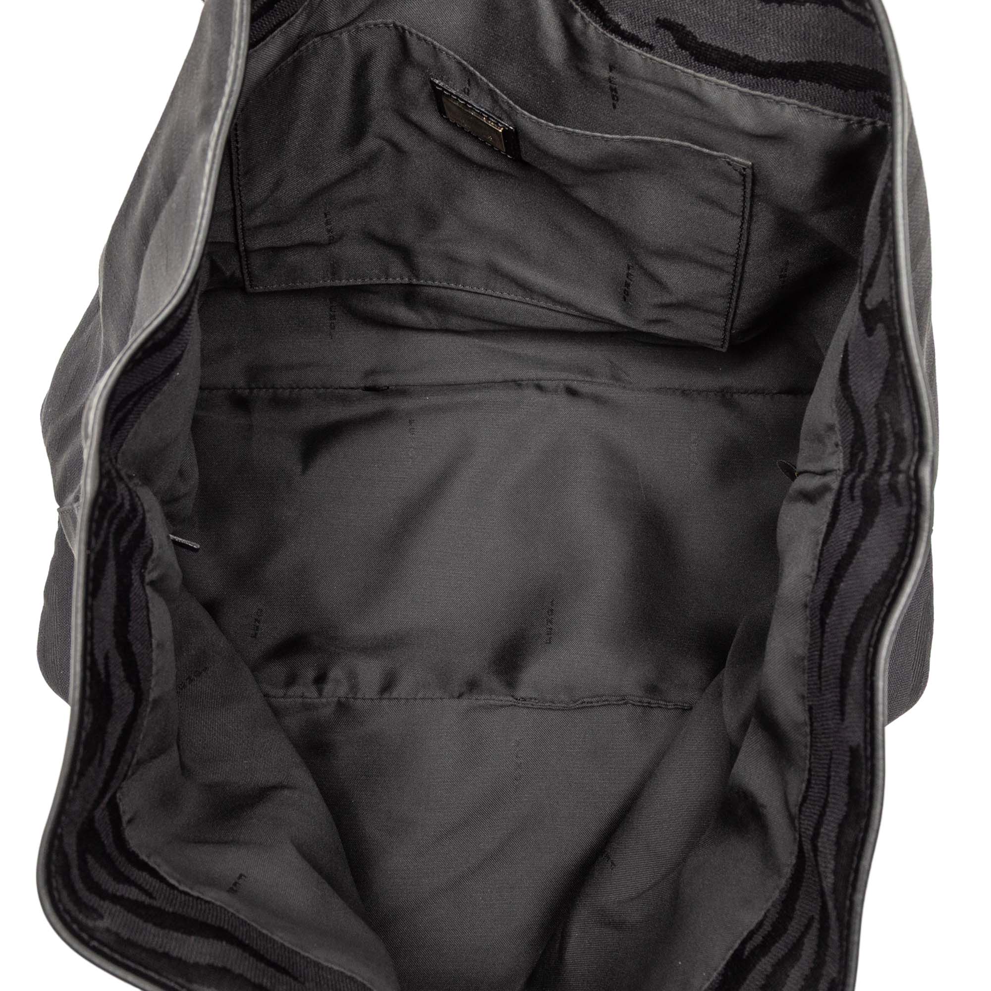 This tote bag features a tiger print canvas body with leather trim, rolled leather handles, a top magnetic snap button closure, and an interior slip pocket.
