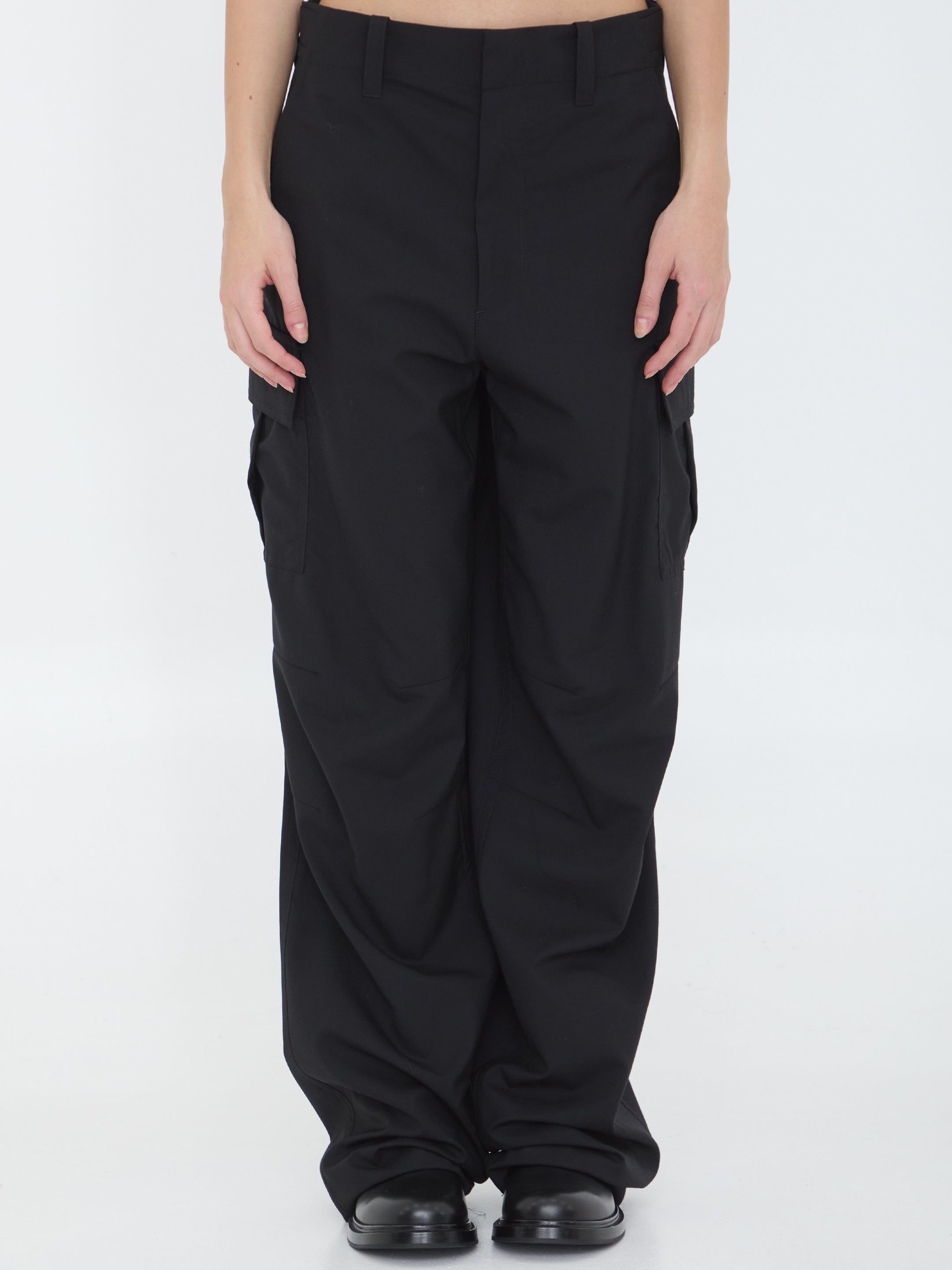 Cargo trousers in lightweight black wool. Feature belt loops, back waist buttons, zip fly with hook and button closure, two horizontal front pockets, two side flap pockets with buttons, and two back flap pockets with buttons, mid-rise waist and wide-leg silhouette. Regular fit.