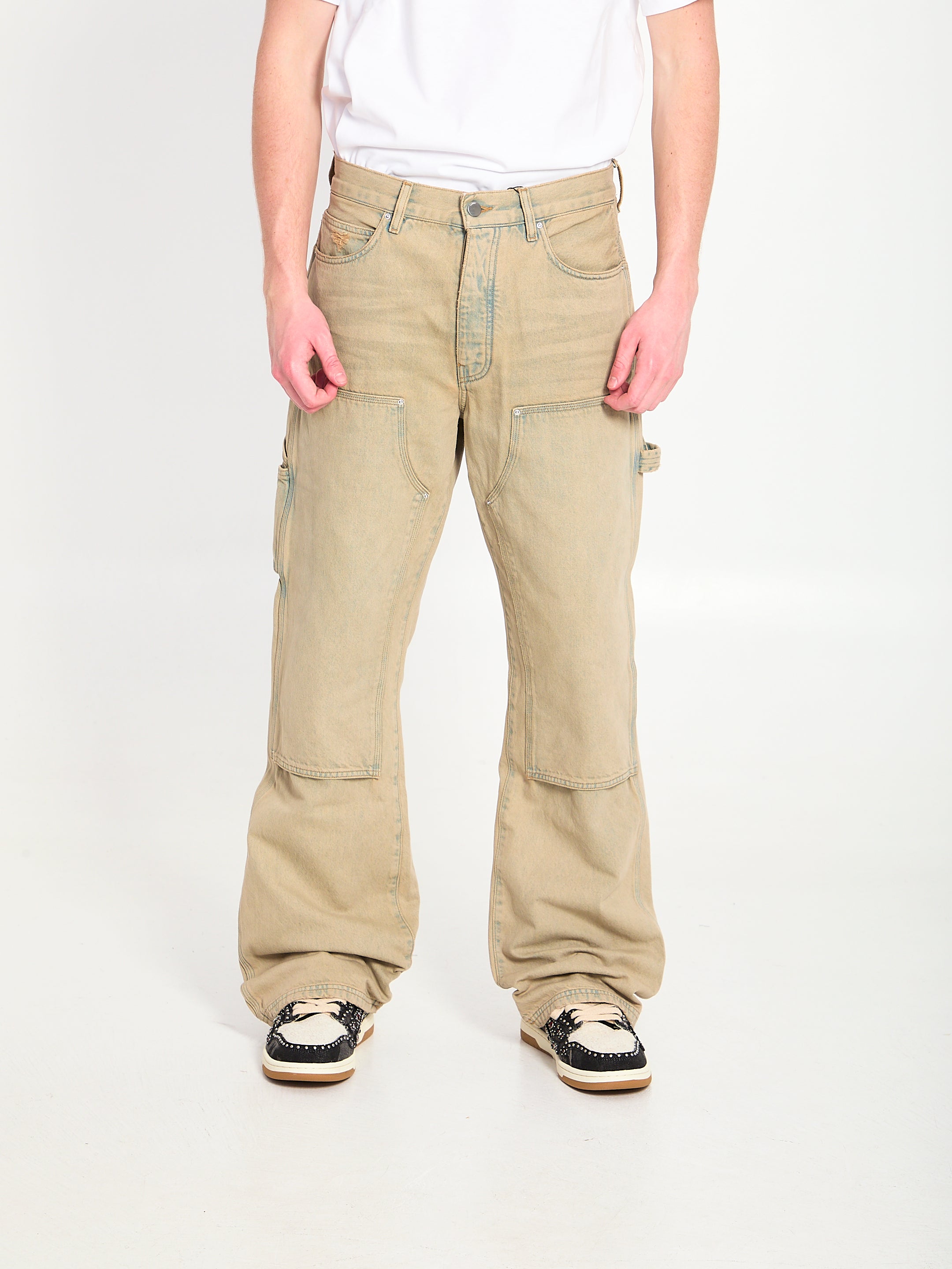 BEIGE COTTON DENIM JEANS WITH THREE-STEP ANTICORROSION TREATMENT FROM AN INDIGO BASE. FEATURE BELT LOOPS, BUTTON FRONT CLOSURE, SIX POCKETS, SIDE CARPENTER LOOP, PATCHES ON THE FRONT, SUEDE PATCH WITH AMIRI SIGNATURE AND METAL LOGO ON THE BACK, MID-RISE WAIST, WIDE LEG. REGULAR FIT.
