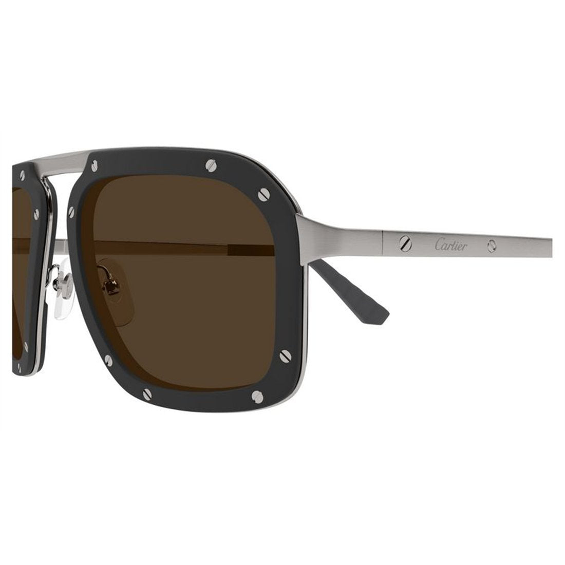 Elevate your eyewear collection with the Cartier CT0573S 003 sunglasses, a sophisticated blend of luxury craftsmanship and contemporary design. Featuring a sleek grey metal frame paired with rich brown lenses, these sunglasses offer both superior UV protection and unmistakable style.