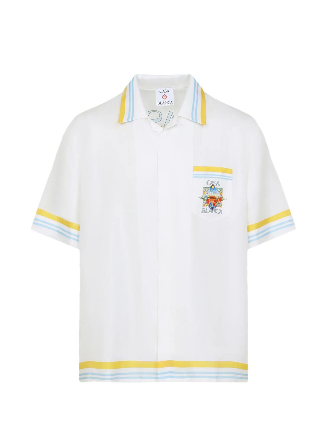 Elevate your warm-weather wardrobe with this sophisticated camp-collar printed shirt from Casablanca. Crafted in crisp white with vibrant yellow and blue striped trim details, this short-sleeve shirt features the brand's signature embroidered motif on the chest pocket.