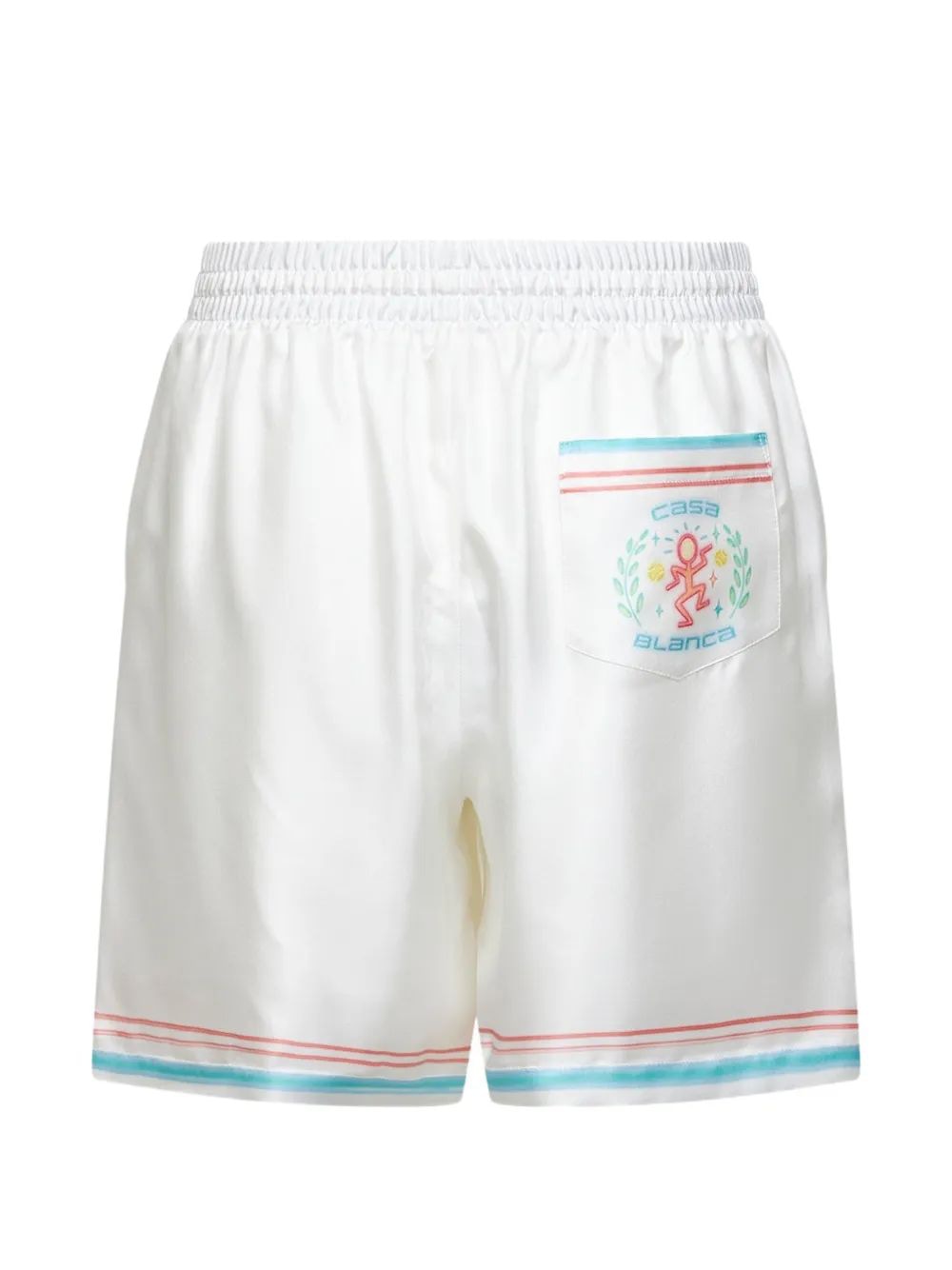 These pristine white shorts feature a comfortable elasticated waistband with drawstring closure and are finished with distinctive multicolored striped detailing at the hem, adding a playful yet sophisticated touch to the design.
