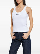 Crafted in a crisp white hue, this sleeveless tank features the signature Casablanca logo across the chest, adding a designer touch to your casual wardrobe. The flattering scoop neckline and fitted silhouette make it perfect for layering under blazers or wearing solo with your favorite denim.