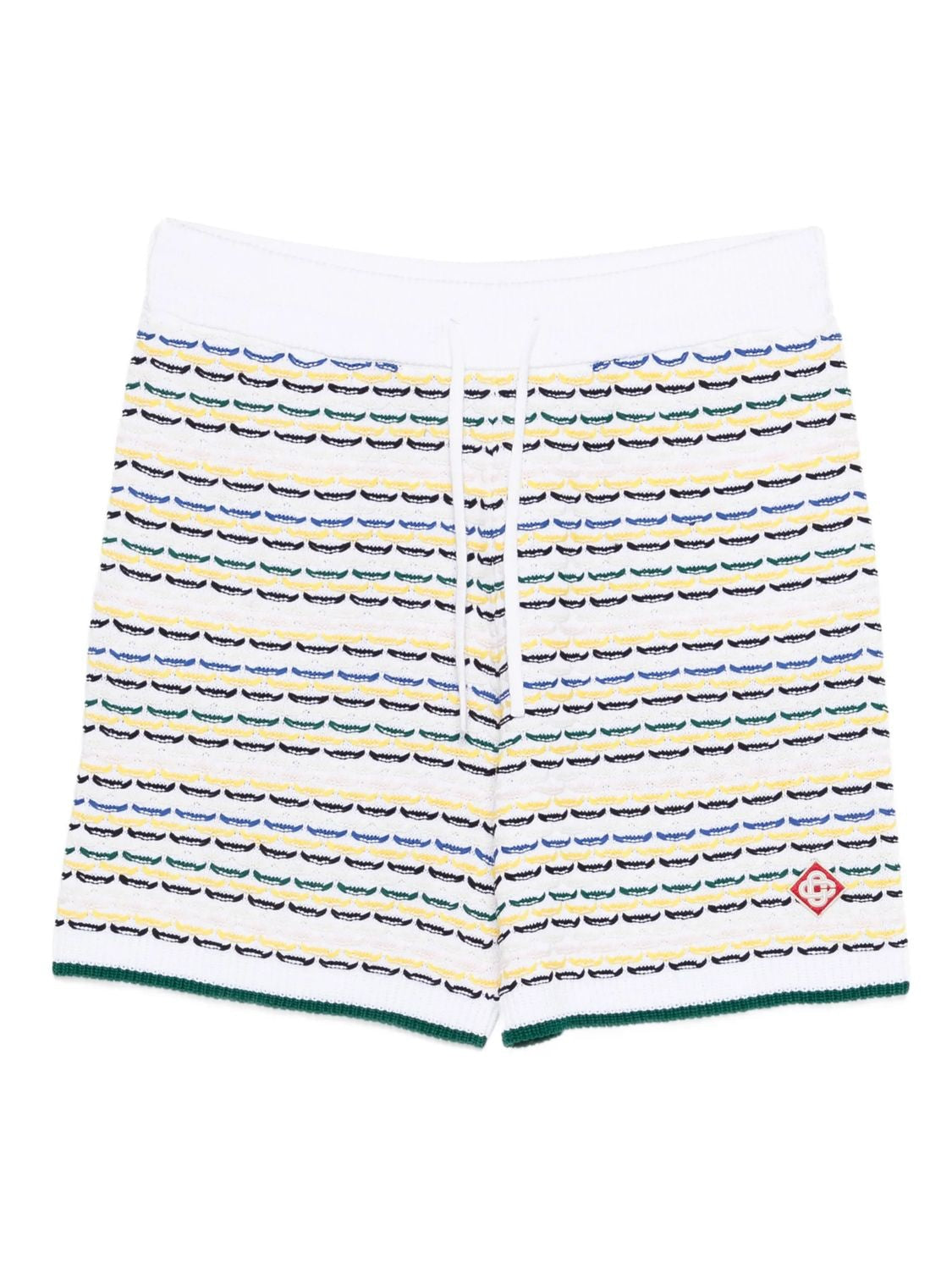 Elevate your warm-weather wardrobe with these luxurious Casablanca Patterned Shorts. Crafted with meticulous attention to detail, these shorts feature a distinctive horizontal striped pattern in a sophisticated palette of white, blue, yellow, and green that captures the brand's signature resort-inspired aesthetic.
