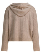 Max Mara Pure cashmere cardigan made from pure cashmere yarn. The construction features a wide rib knit throughout. The construction features a drawstring hood, straight line at the shoulders and slightly crop length at the waist. The silhouette is comfortable, with long sleeves with a low turn and front closure via a double-slider zipper. Edges and cuffs are ribbed finished, leather logo label applied to the left cuff.