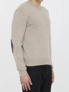 LONG-SLEEVED CREWNECK JUMPER IN BEIGE CASHMERE WITH BLACK LEATHER PATCHES WITH INTRECCIO PATTERN ON THE ELBOWS. RIBBED NECK, CUFFS AND HEM. REGULAR FIT.
