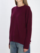 BURGUNDY CASHMERE SWEATER. FEATURES RIBBED CREW NECK, LONG SLEEVES, SMALL SIDE SLITS, AND RIBBED FINISHES. RELAXED FIT.