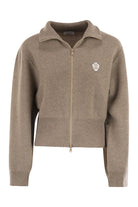 CLASSIC LINES AND SPORTY STYLE COME TOGETHER IN THIS NEW PURE CASHMERE JUMPER, INSPIRED BY THE SWEATSHIRT STYLE. THE LUMINOUS REFLECTIONS OF THE LAMé THREAD GIVE THE GARMENT A DELICATE SHIMMER, WHILE THE ICONIC SOLOMEO COAT OF ARMS ON THE CHEST COMPLETES THE LOOK. THE SOFT AND LIGHTWEIGHT SPARKLING CASHMERE YARN COMBINES THE FINE QUALITIES OF NATURAL FIBRE WITH A LAMé THREAD THAT ENRICHES THE TEXTURE WITH DELICATE REFLECTIONS. - ZIP FASTENING - DROPPED SHOULDER - CREST ON THE CHEST DESIGNER ID: M1E206506 CIT23