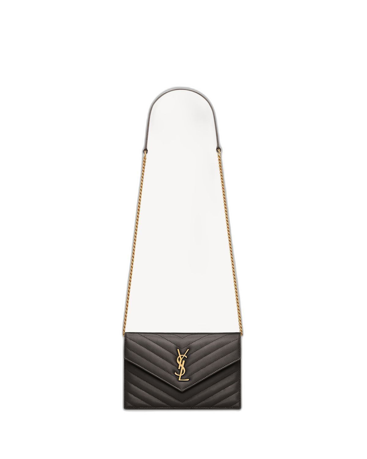 Elevate your evening ensemble with the iconic Saint Laurent Cassandre Envelope bag. This luxurious crossbody features the brand's signature chevron-quilted leather in a sleek black finish, adorned with the unmistakable gold-tone YSL monogram hardware.