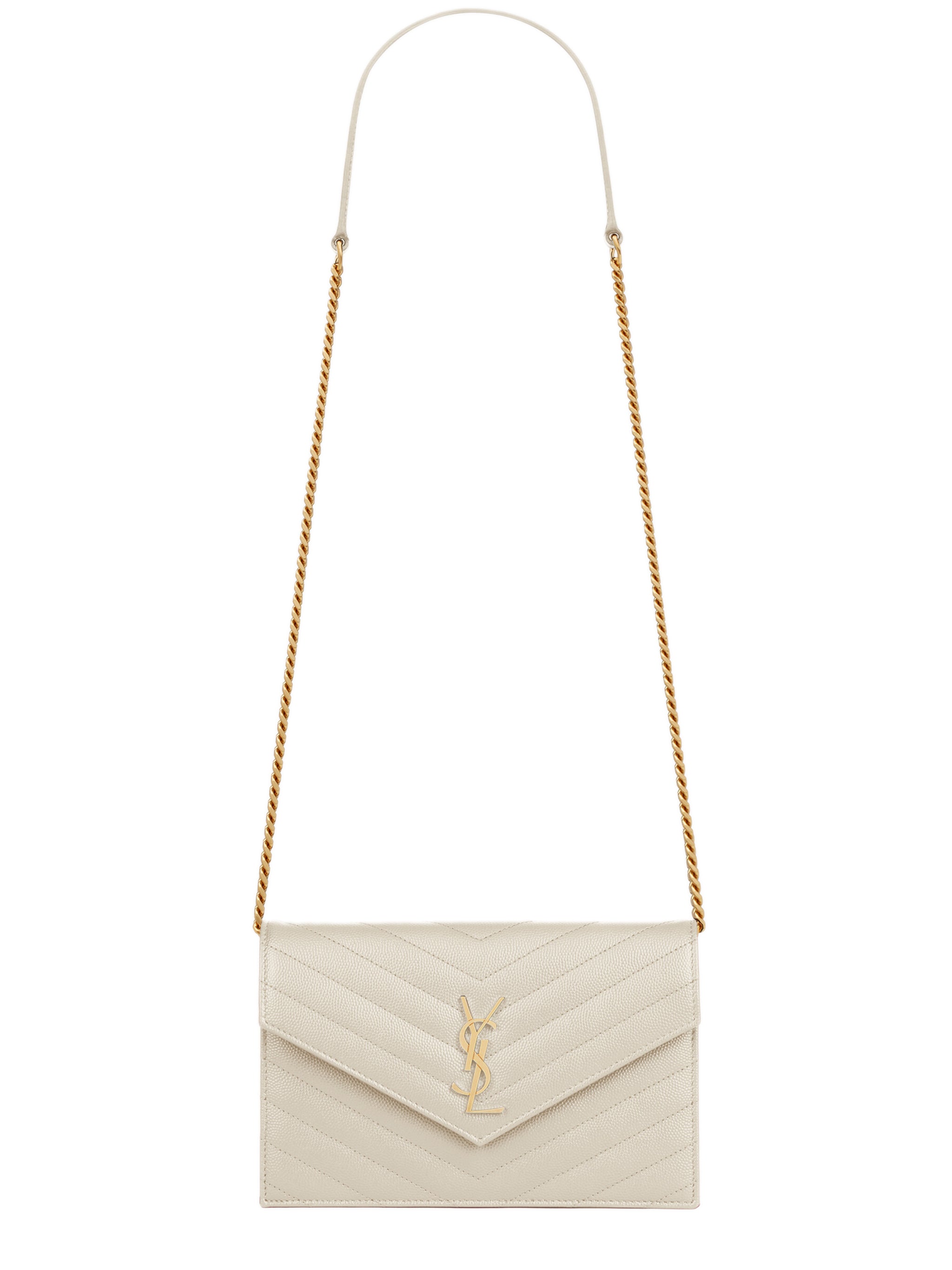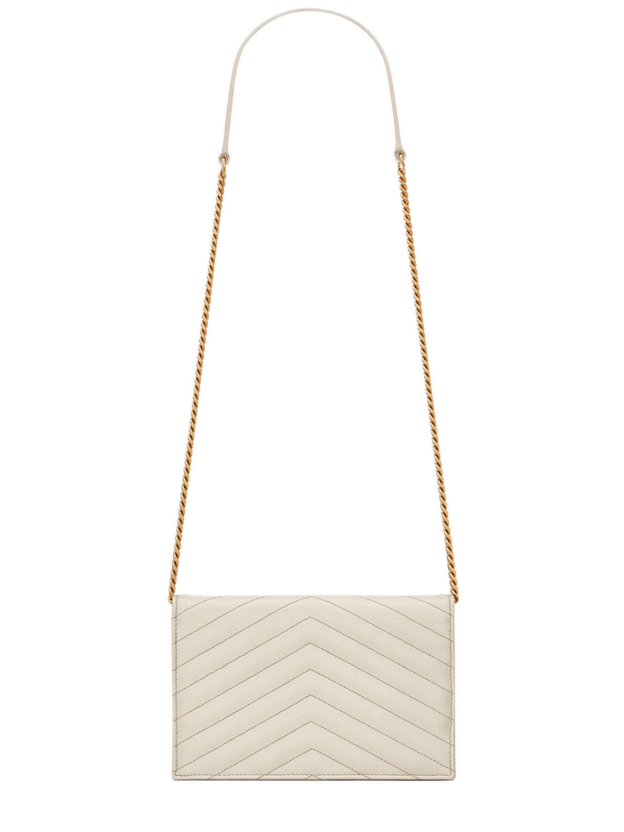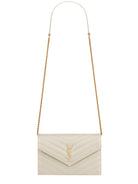 Crafted from luxurious 100% leather in Italy, this elegant envelope-style wallet features the iconic YSL logo and a detachable leather-reinforced chain strap, allowing you to wear it as a chic crossbody bag or carry it as a refined clutch.