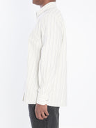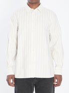 Shirt in white cotton featuring khaki and brown stripe pattern. Designed with long sleeves, pointed collar, front button closure, single-button cuffs, straight hem, and a box pleat at the center back. Regular fit.