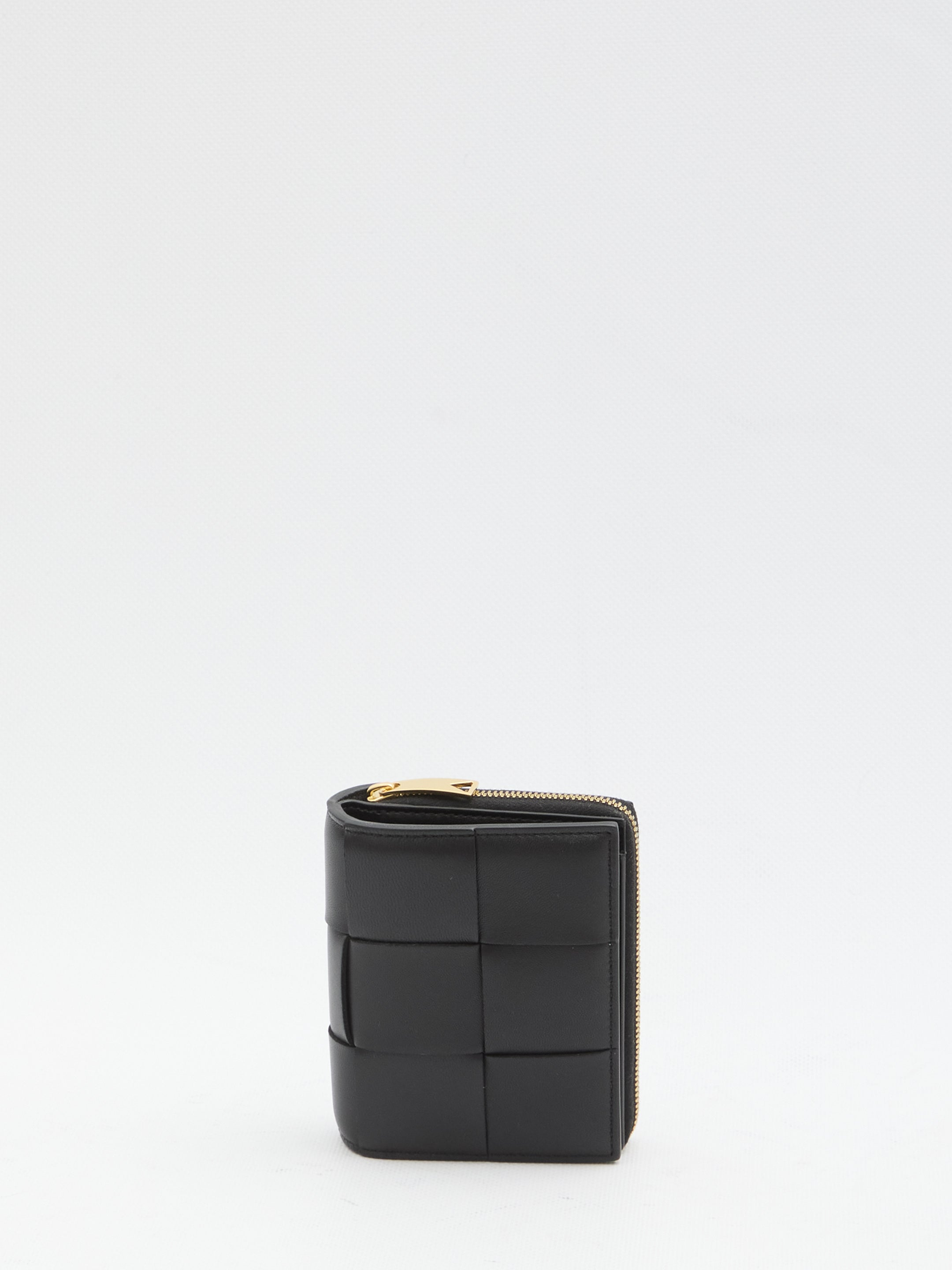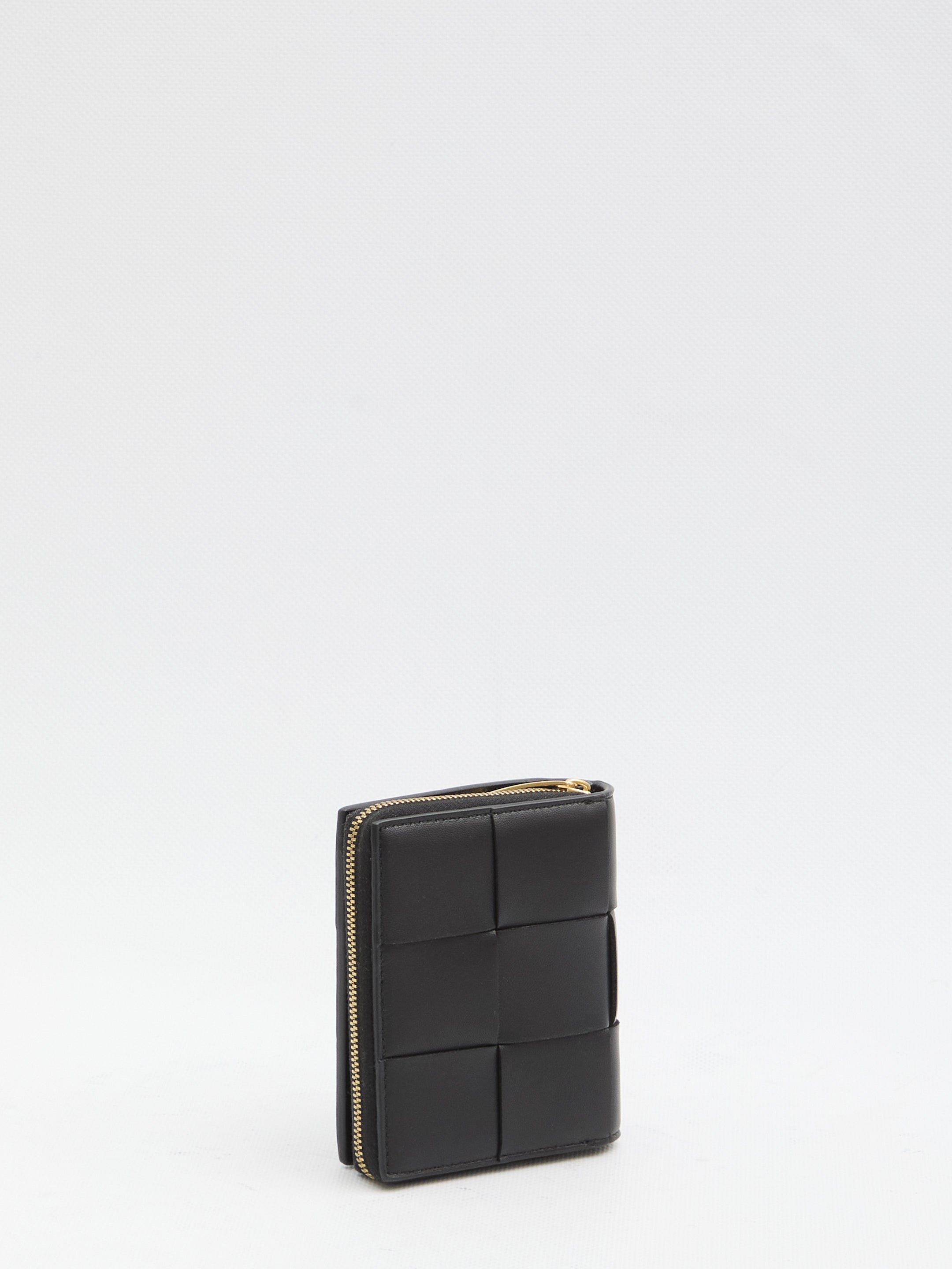 BLACK LAMBSKIN WALLET WITH INTRECCIATO PATTERN. IT FEATURES SIX CARD SLOTS, A BILL COMPARTMENT, AND A ZIPPERED COIN POCKET. ANY IMPERFECTIONS IN THE LEATHER SHOULD NOT BE CONSIDERED MANUFACTURING DEFECTS, BUT A CHARACTERISTIC OF THE MATERIAL.