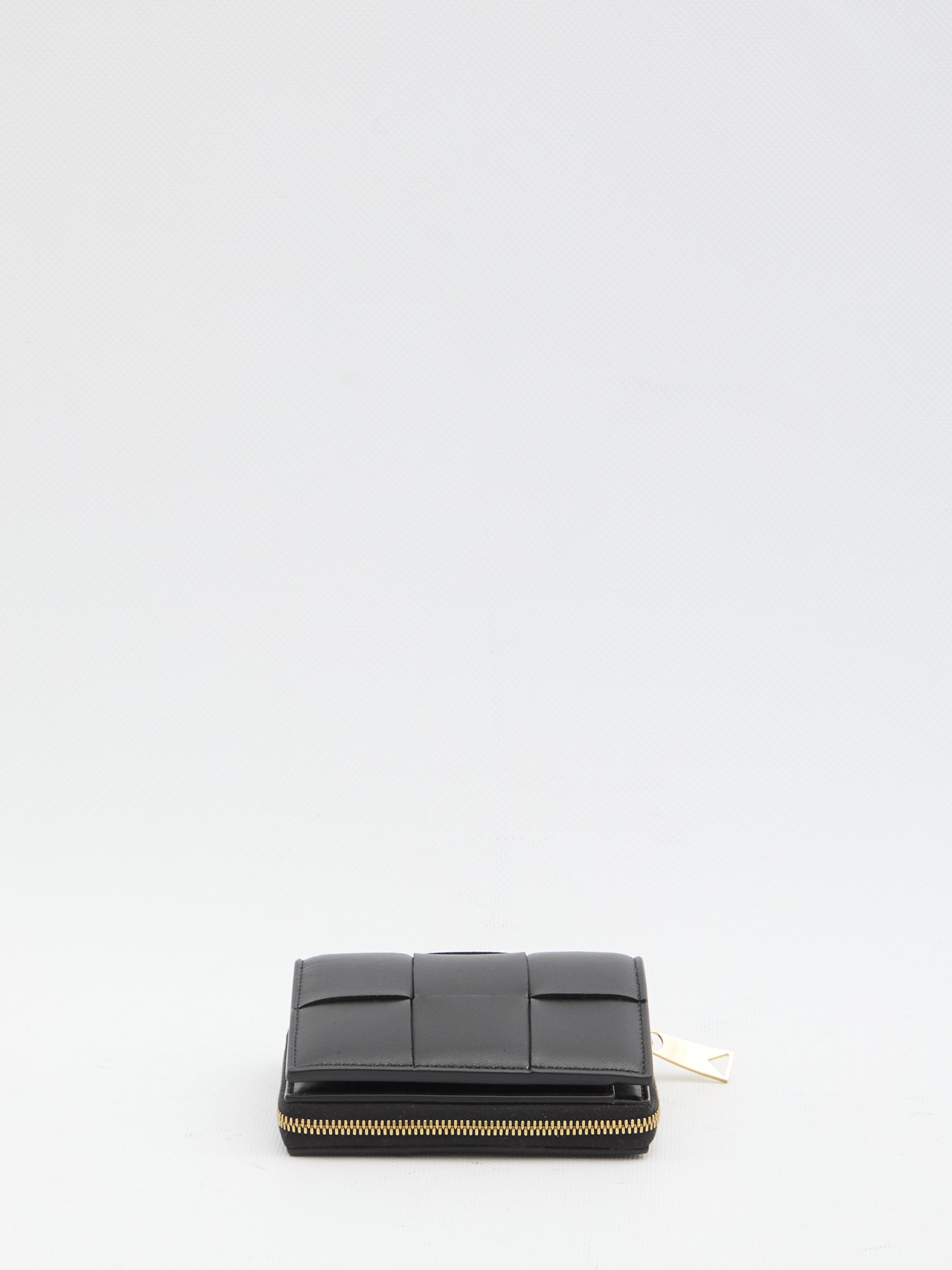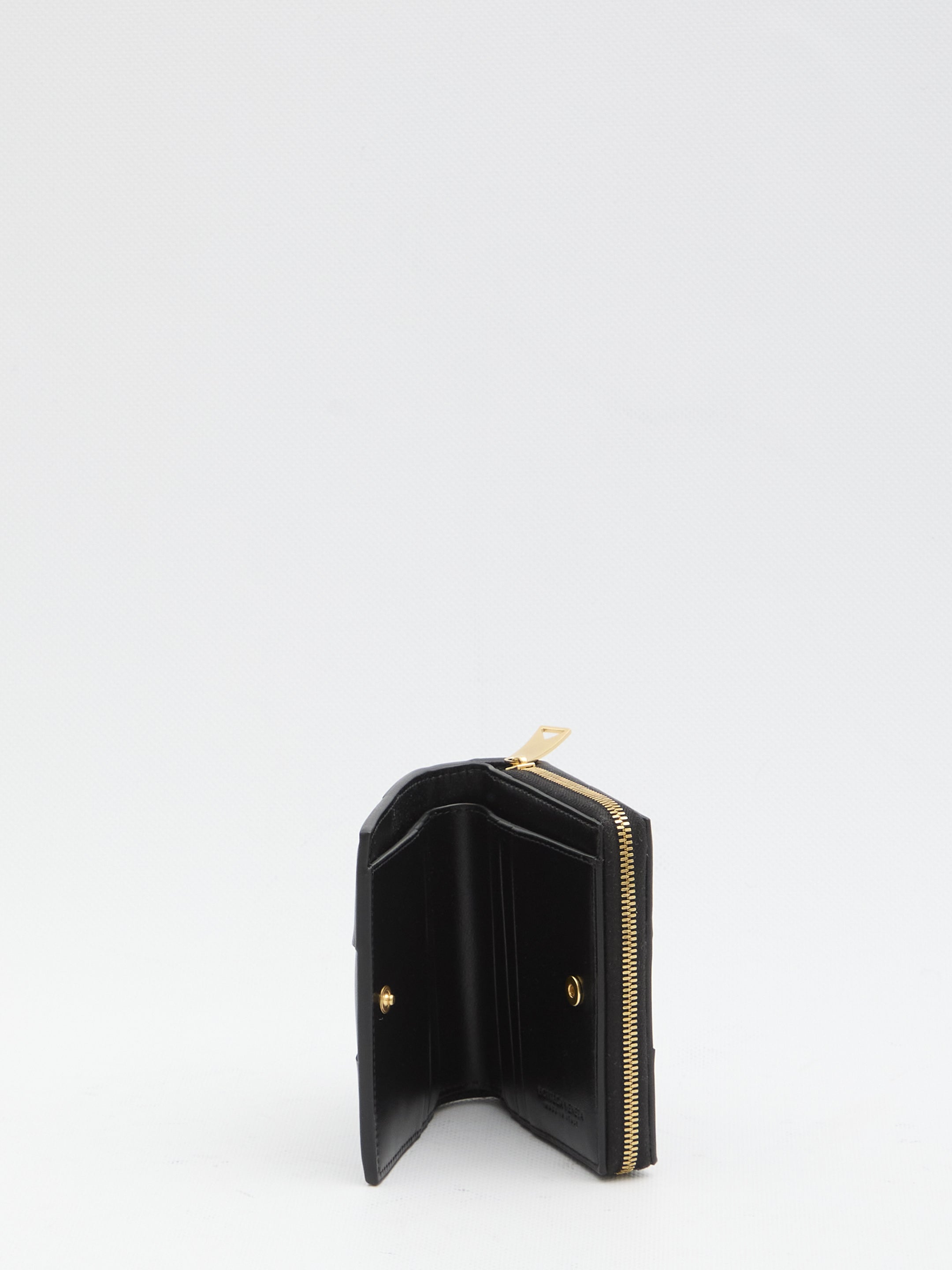 Black lambskin wallet with Intrecciato pattern. It features six card slots, a bill compartment, and a zippered coin pocket. Any imperfections in the leather should not be considered manufacturing defects, but a characteristic of the material.