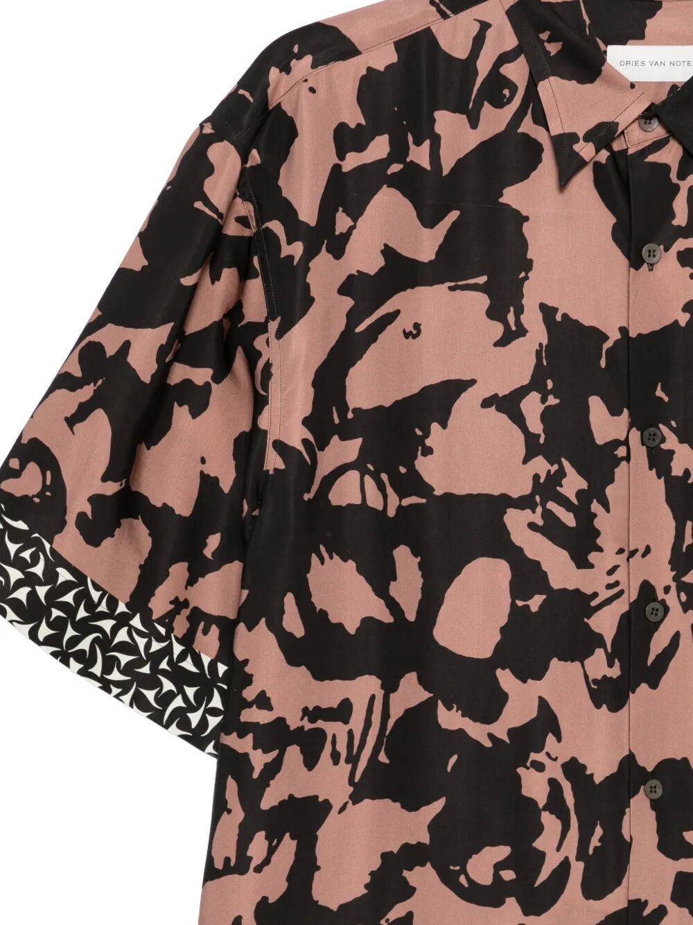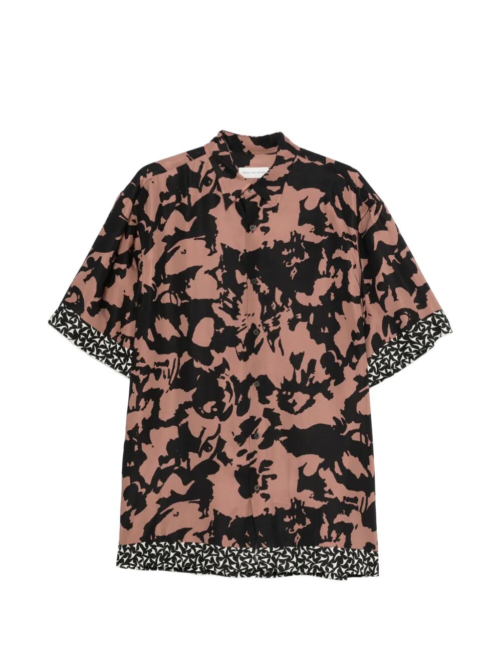 Elevate your casual wardrobe with the "Cassidye" short sleeve print shirt from Dries Van Noten. This statement piece features an eye-catching abstract print in warm peachy tones with contrasting black details, finished with distinctive leopard print trim on the sleeves.
