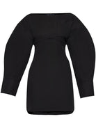 BLACK COTTON POPLIN TEXTURE YOKE DESIGN LAYERED DETAILS CUT-OUT DETAILING BELT LOOPS BELTED WAIST SILVER-TONE HARDWARE BOAT NECK REAR ZIP FASTENING LONG PUFF SLEEVES SIDE SLITS FRONT PATCH POCKET CURVED HEM