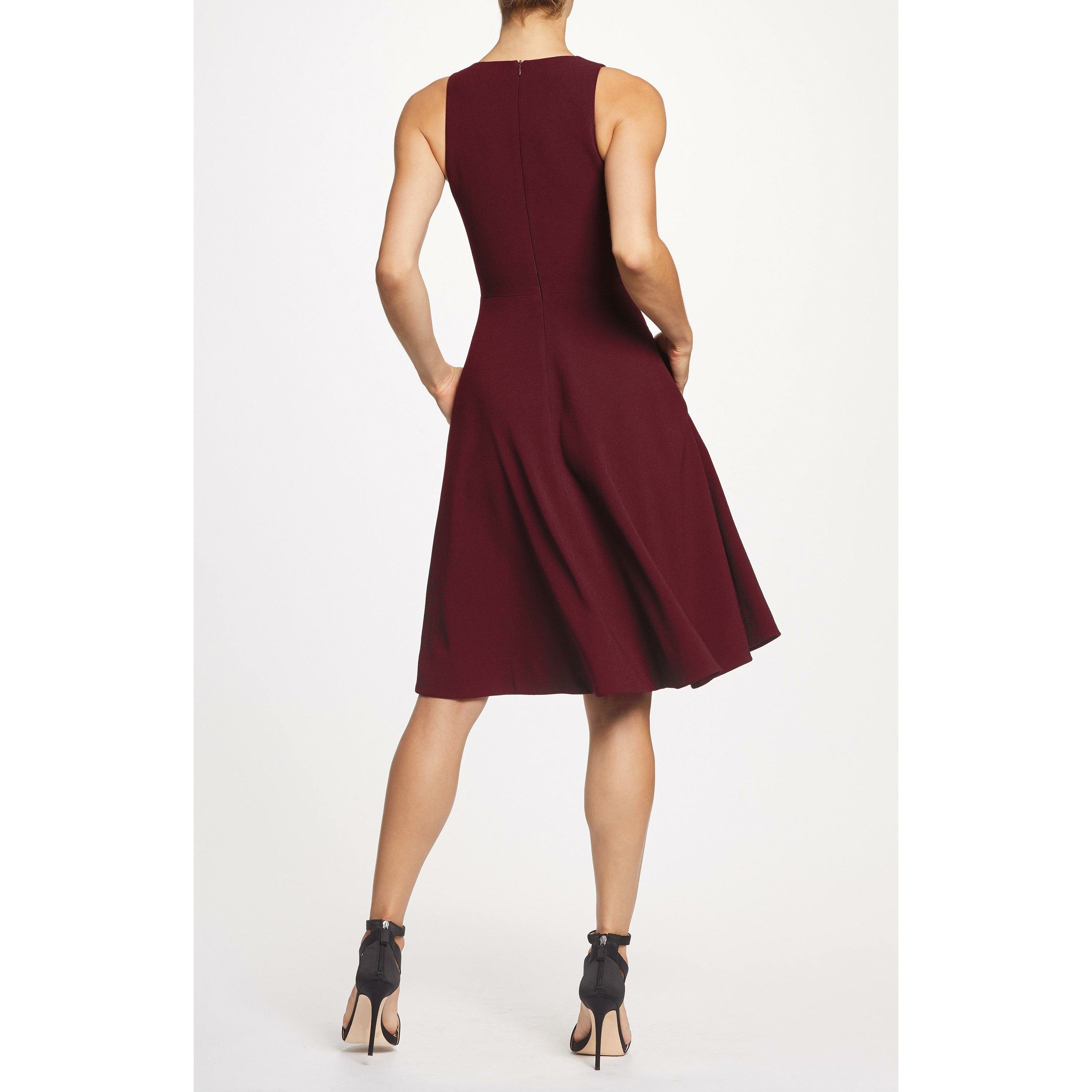 The Catalina is a crepe cocktail dress with a fit and flare silhouette and a v-neckline that flatters all body shapes. The bodice is fitted and tapers in to hug the waist, and the knee-length skirt is playful but polished. This sleeveless dress has modest straps wide enough to cover the shoulders and two side pockets.