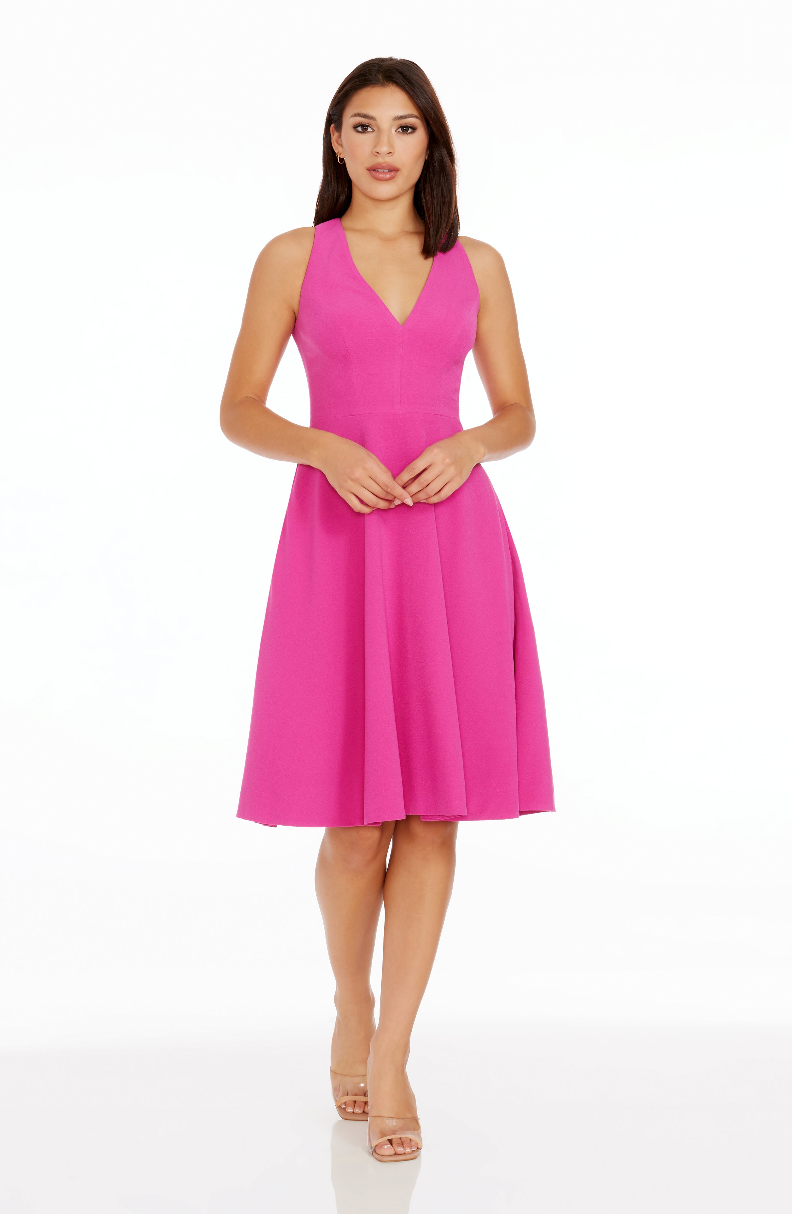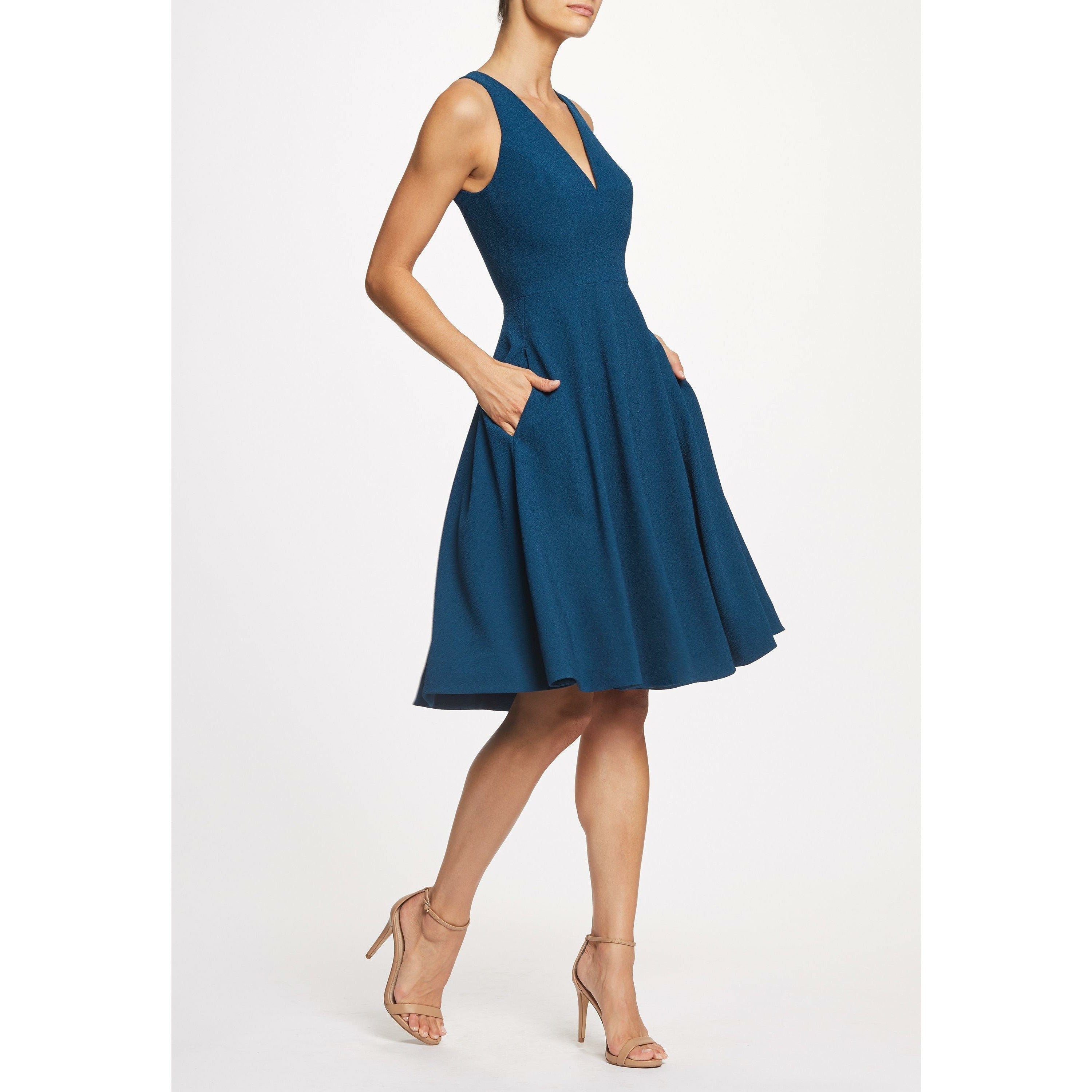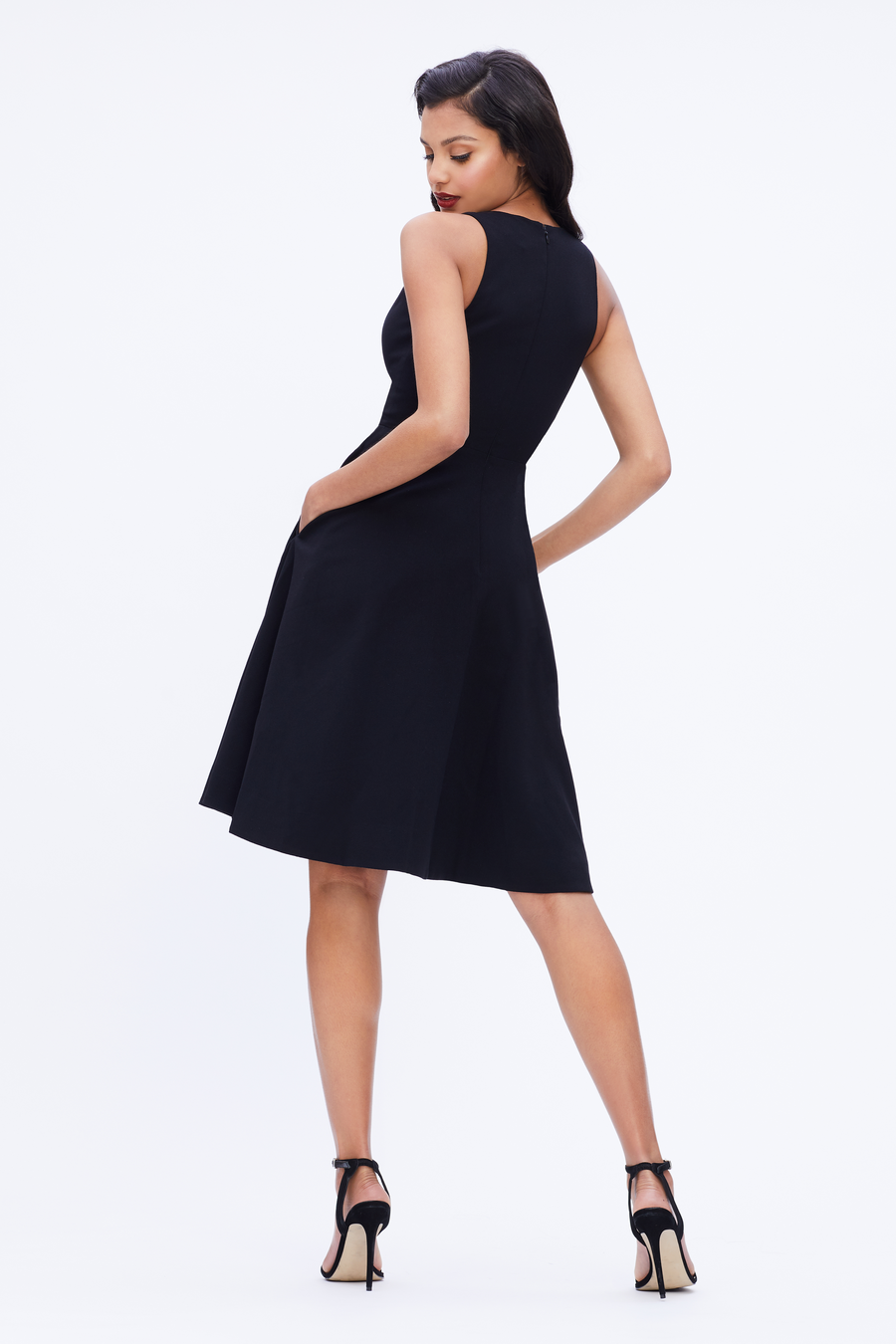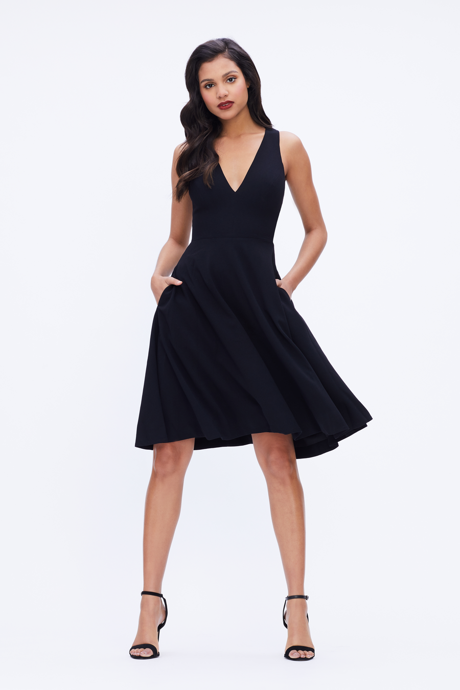 The Catalina is a crepe cocktail dress with a fit and flare silhouette and a v-neckline that flatters all body shapes. The bodice is fitted and tapers in to hug the waist, and the knee-length skirt is playful but polished. This sleeveless dress has wide straps and two side pockets.