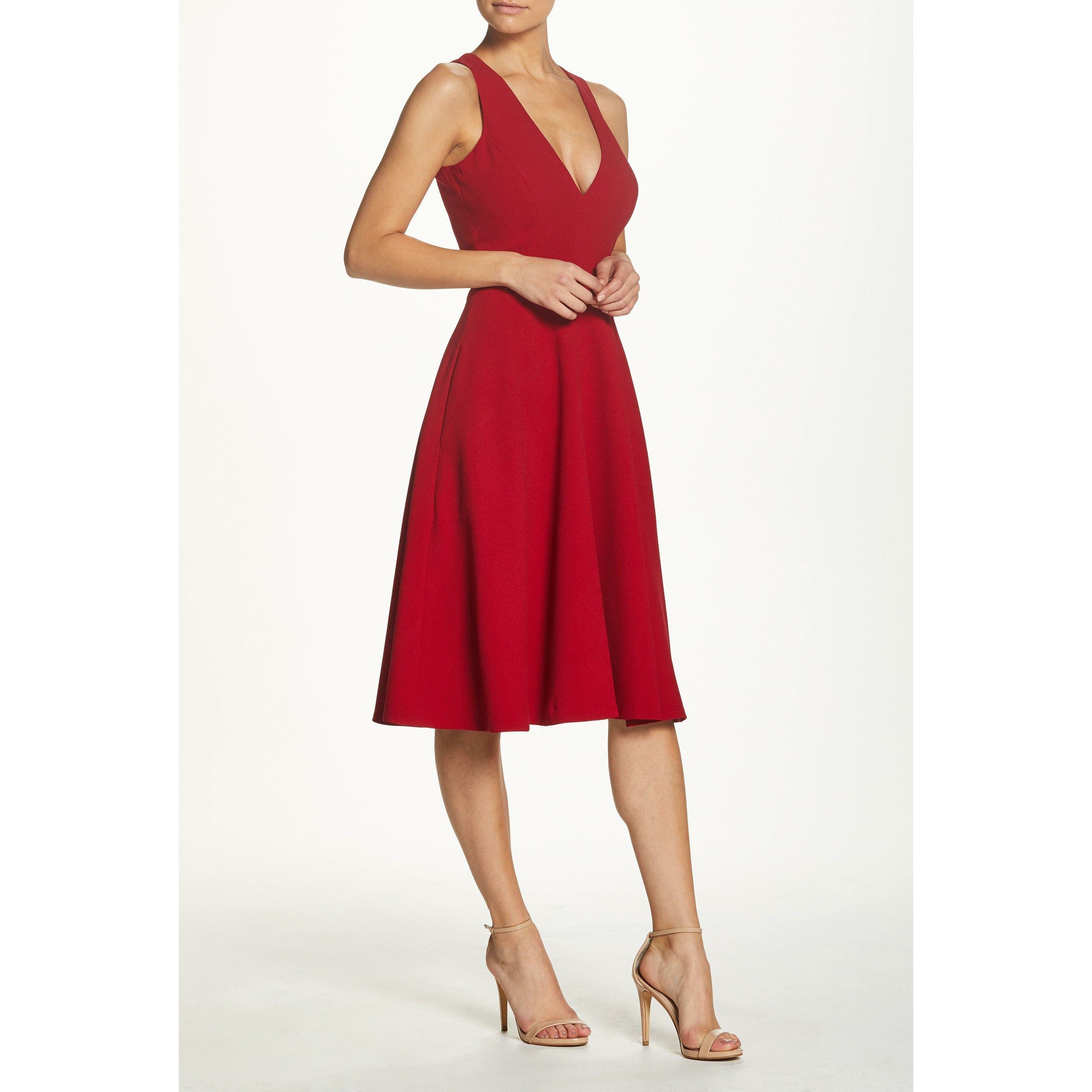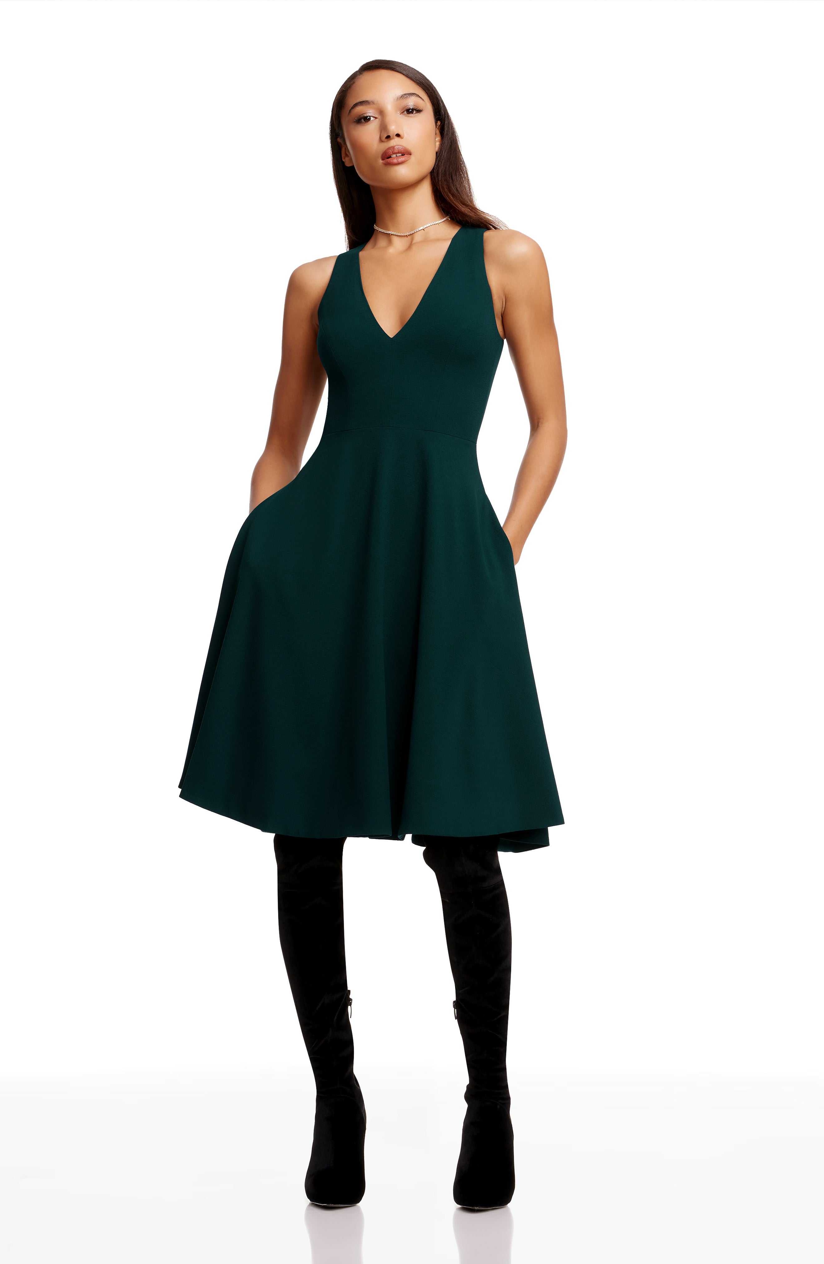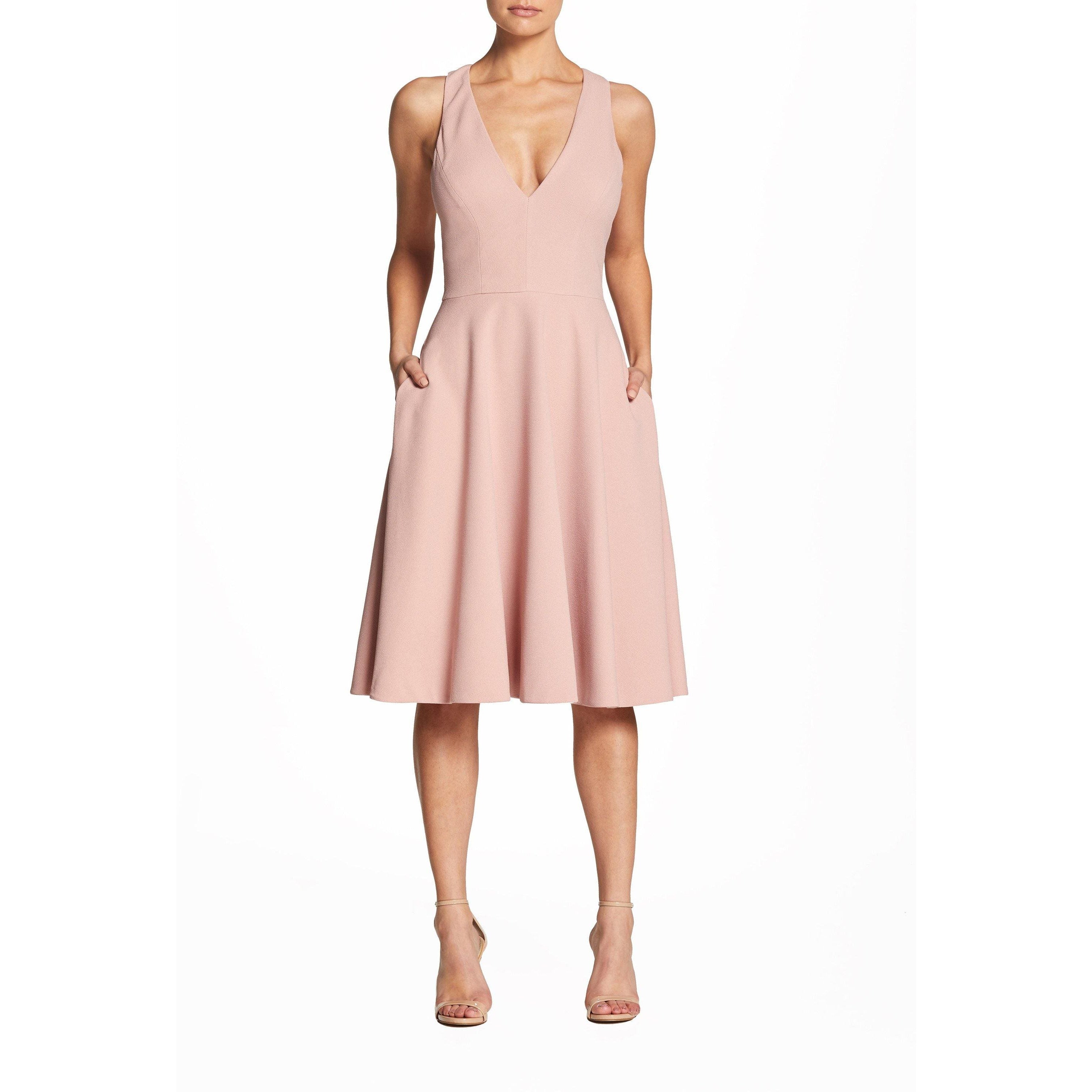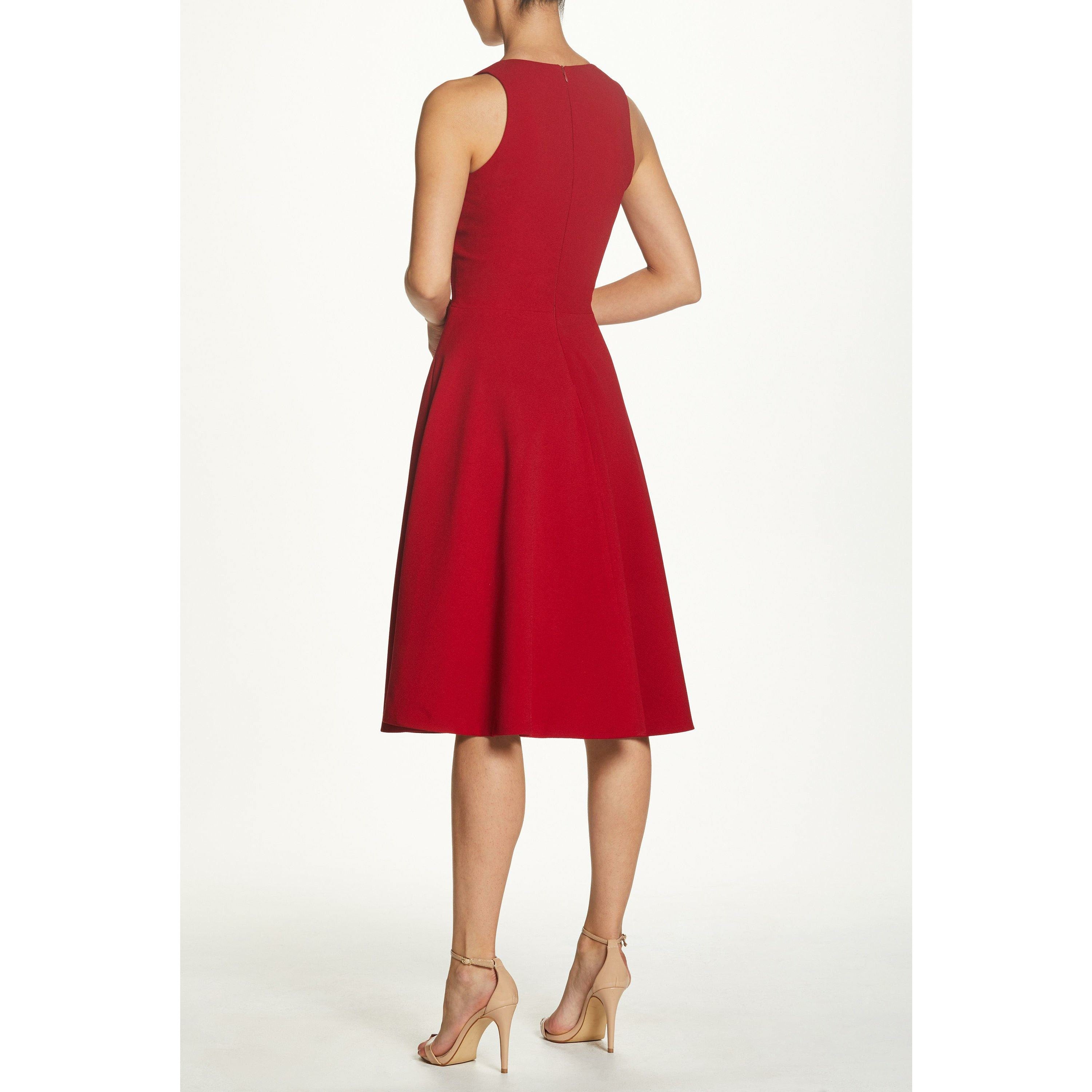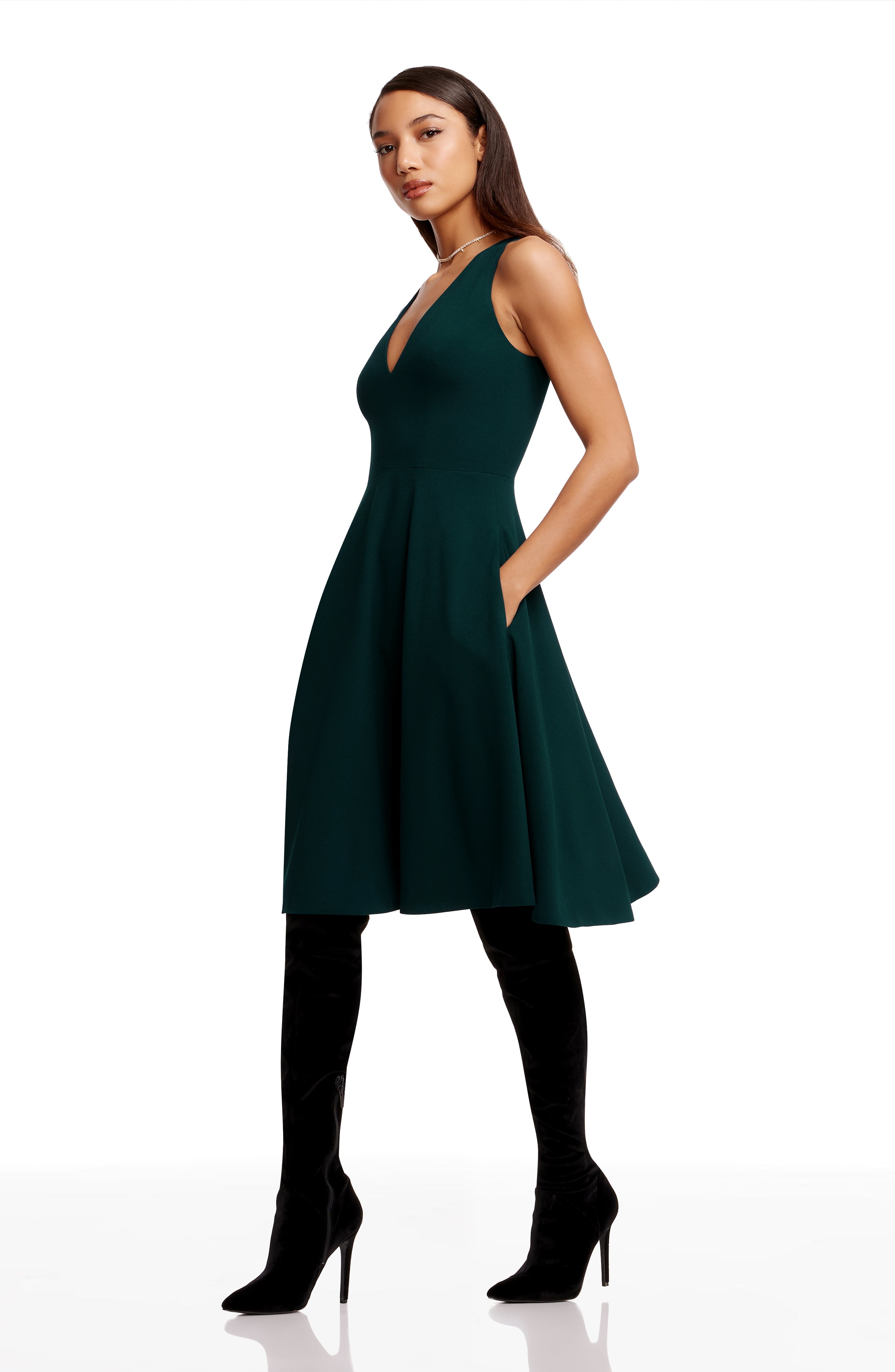 The Catalina is a crepe cocktail dress with a fit and flare silhouette and a v-neckline that flatters all body shapes. The bodice is fitted and tapers in to hug the waist, and the knee-length skirt is playful but polished. This sleeveless dress has wide straps and two side pockets.