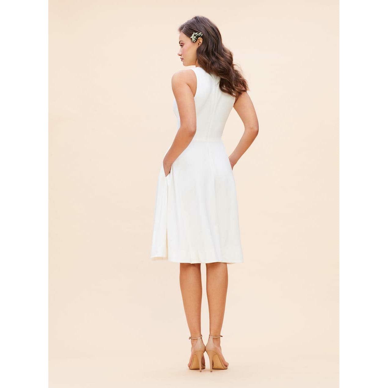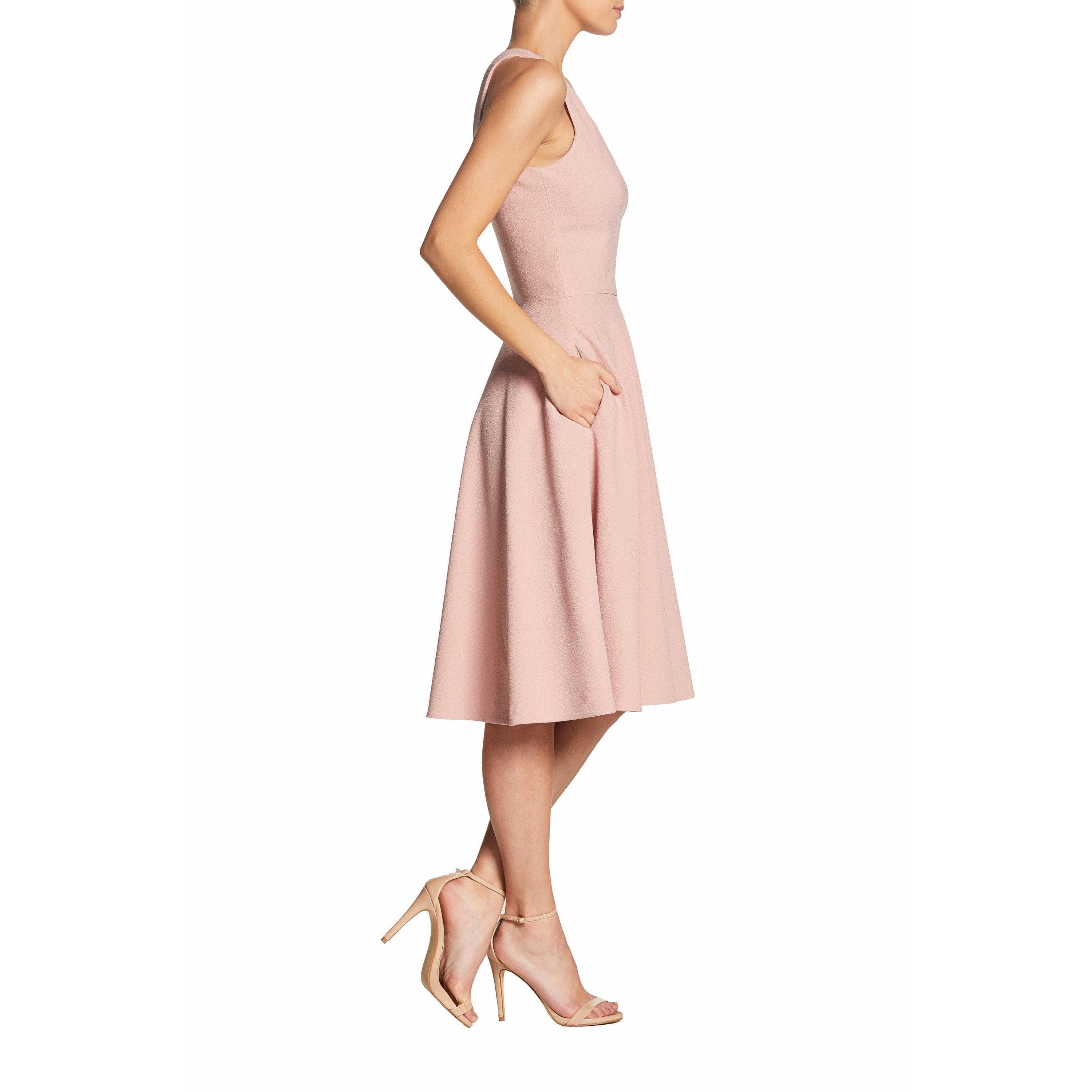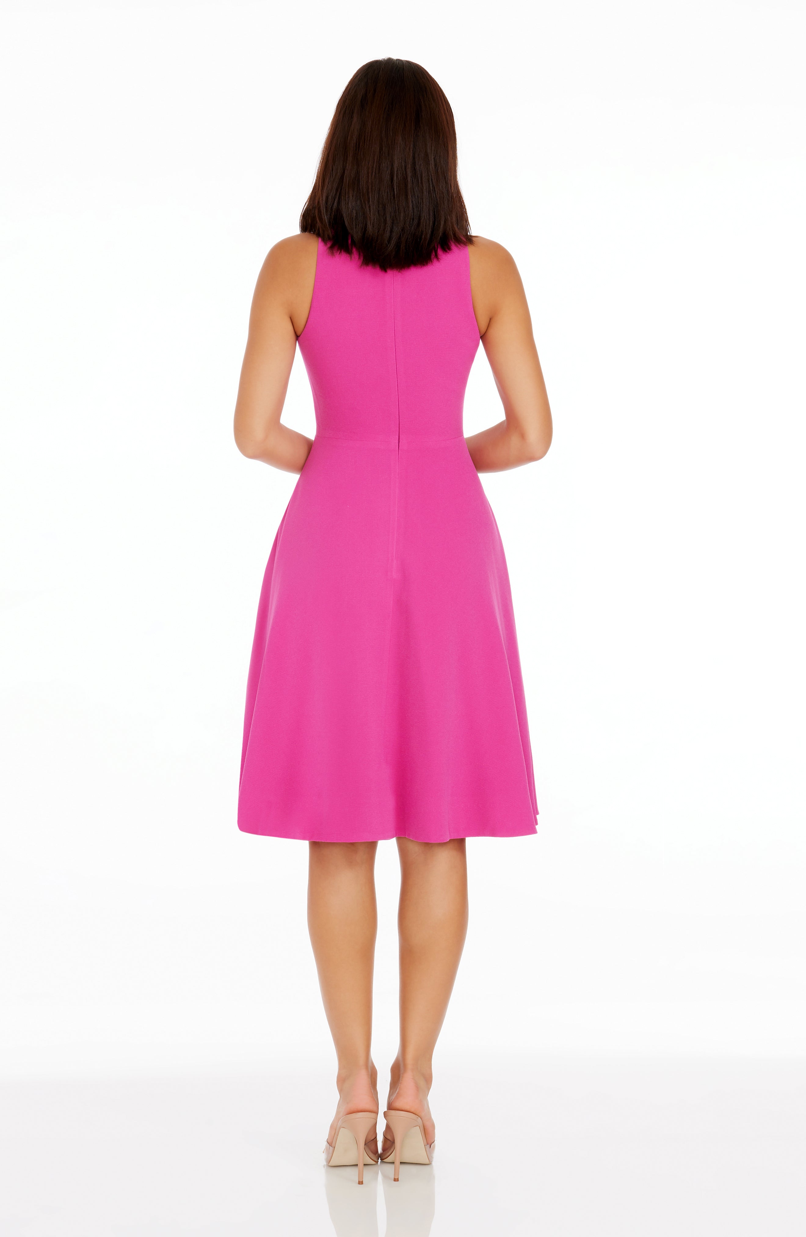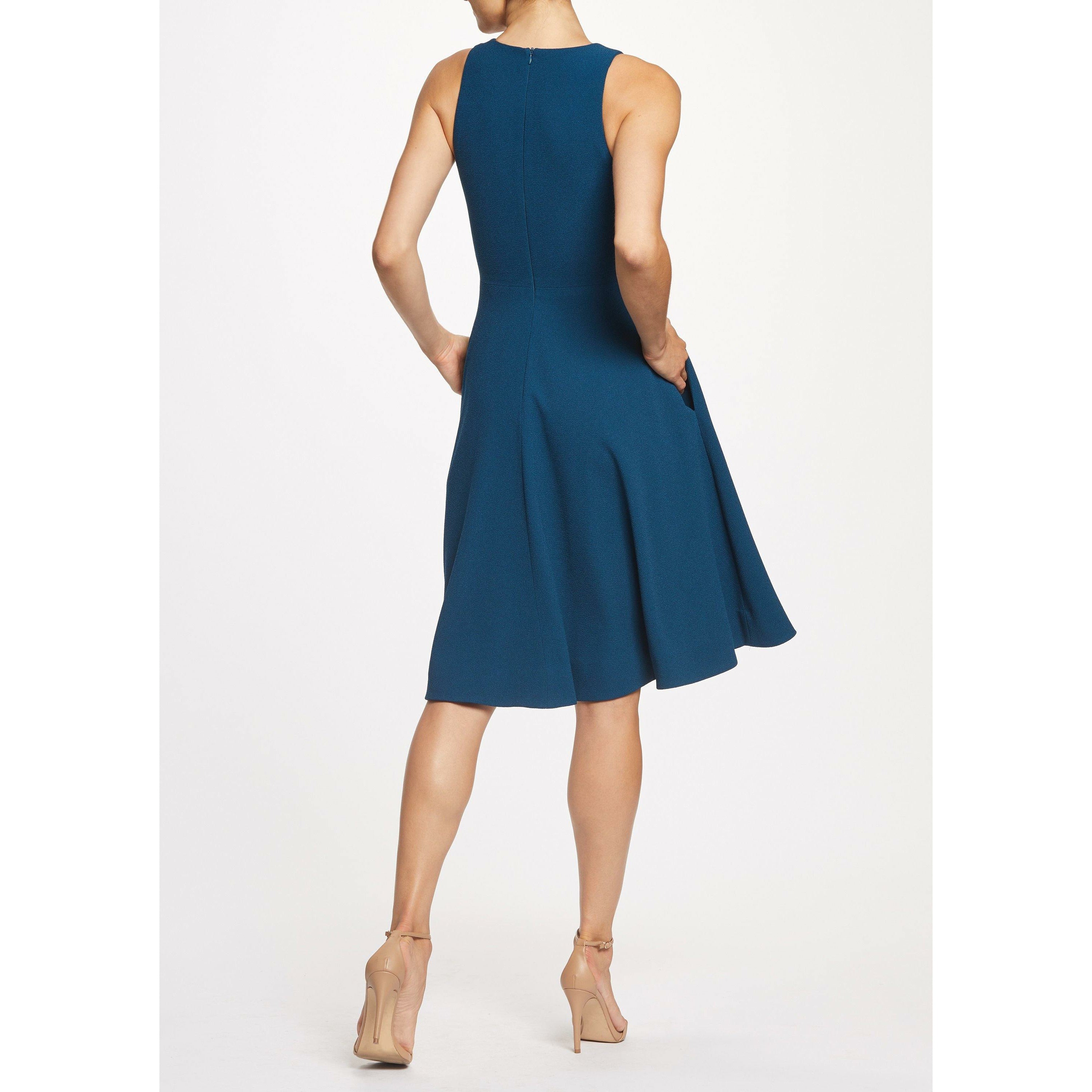 The Catalina is a crepe cocktail dress with a fit and flare silhouette and a v-neckline that flatters all body shapes. The bodice is fitted and tapers in to hug the waist, and the knee-length skirt is playful but polished. This sleeveless dress has wide straps and two side pockets.