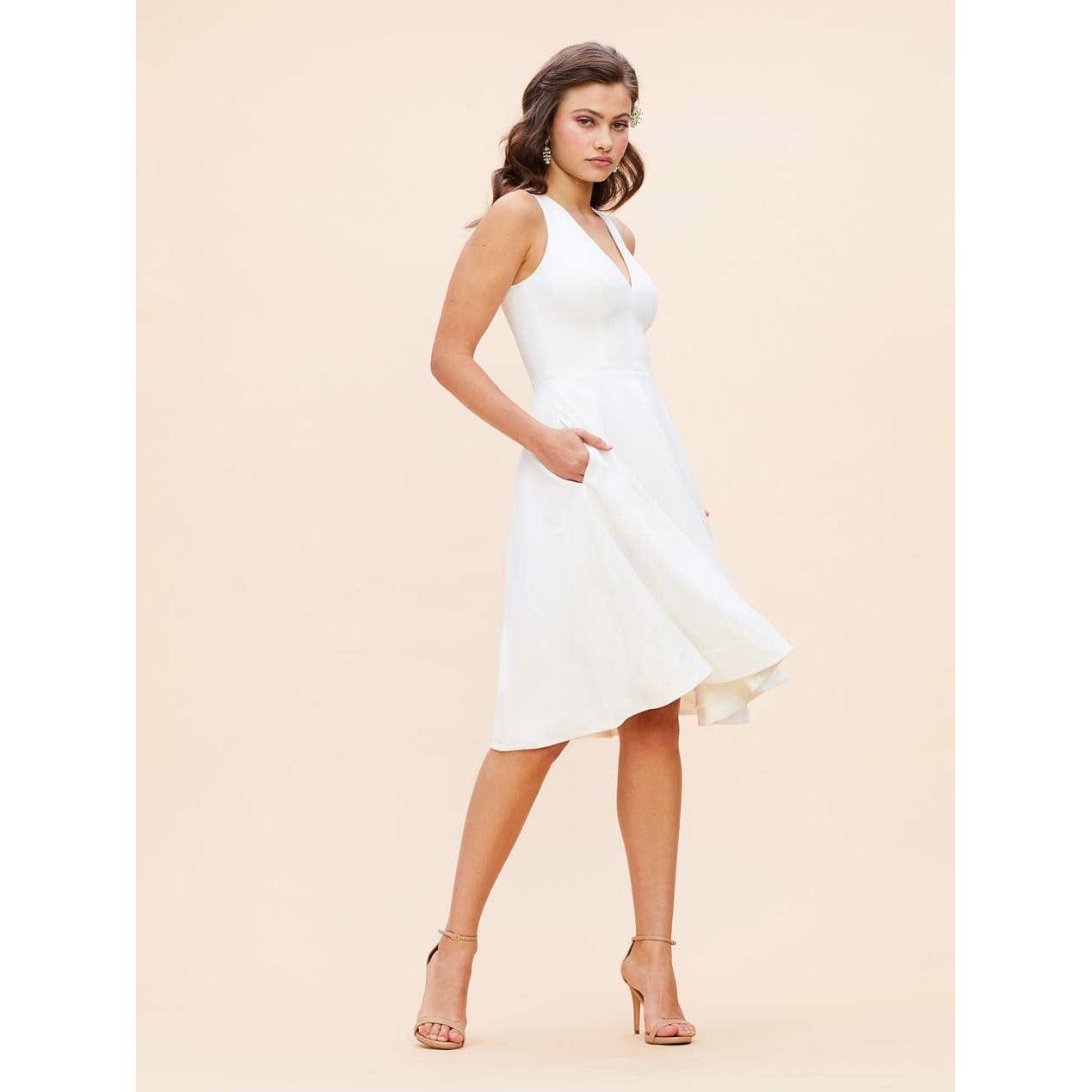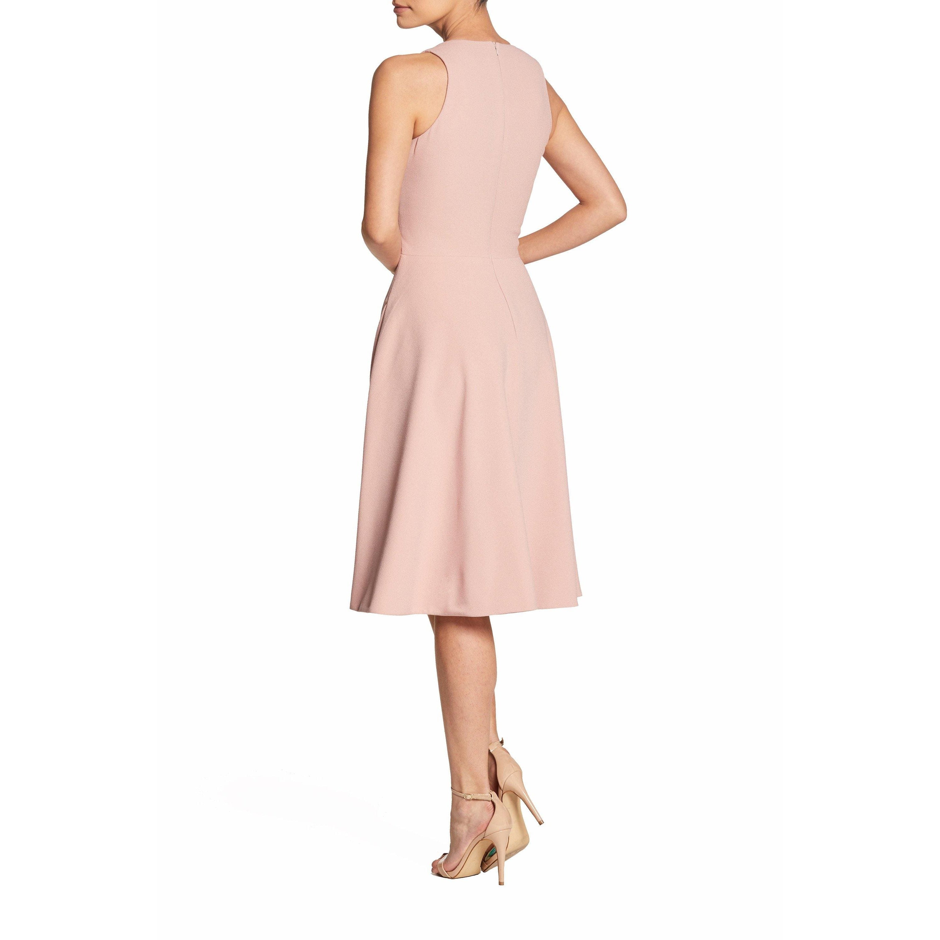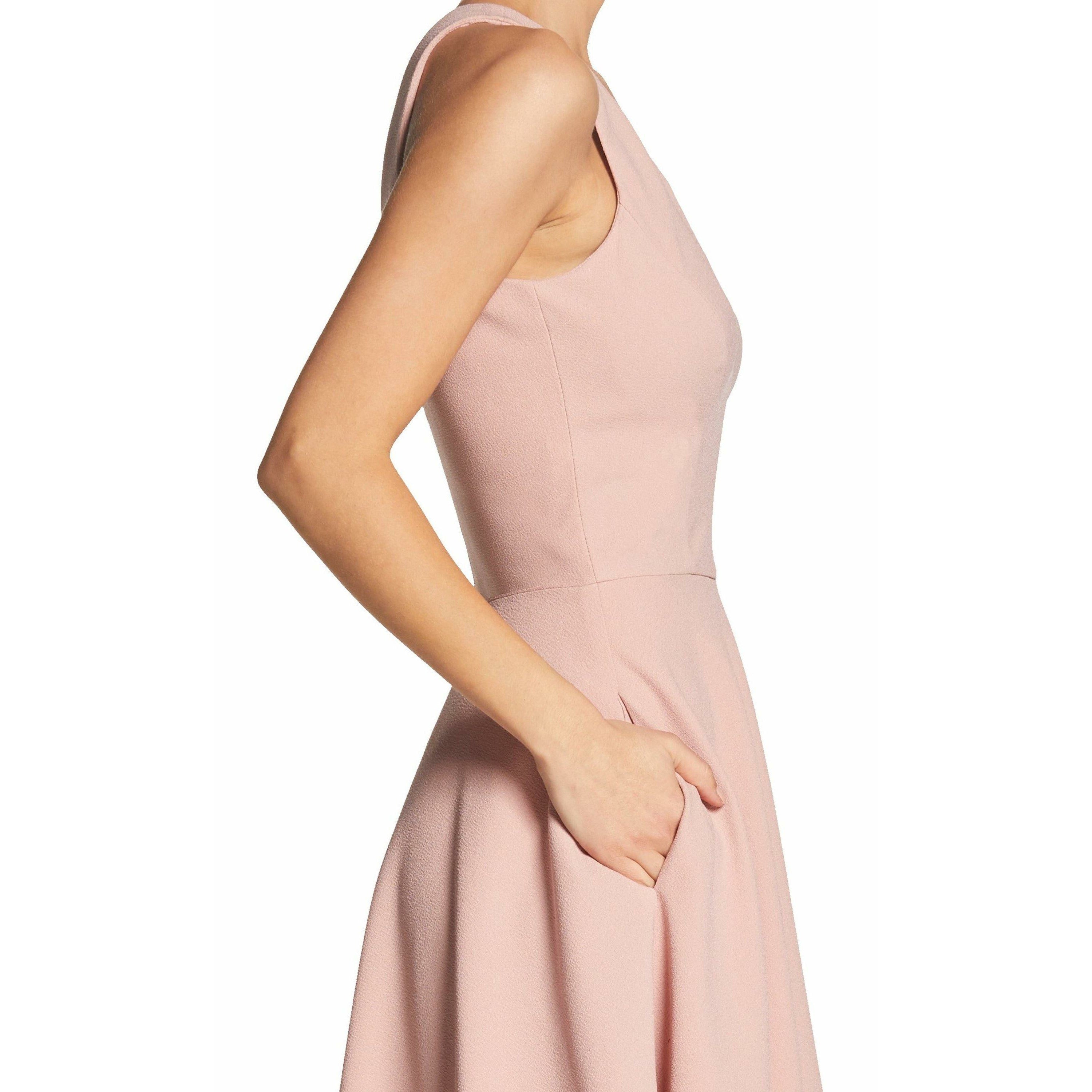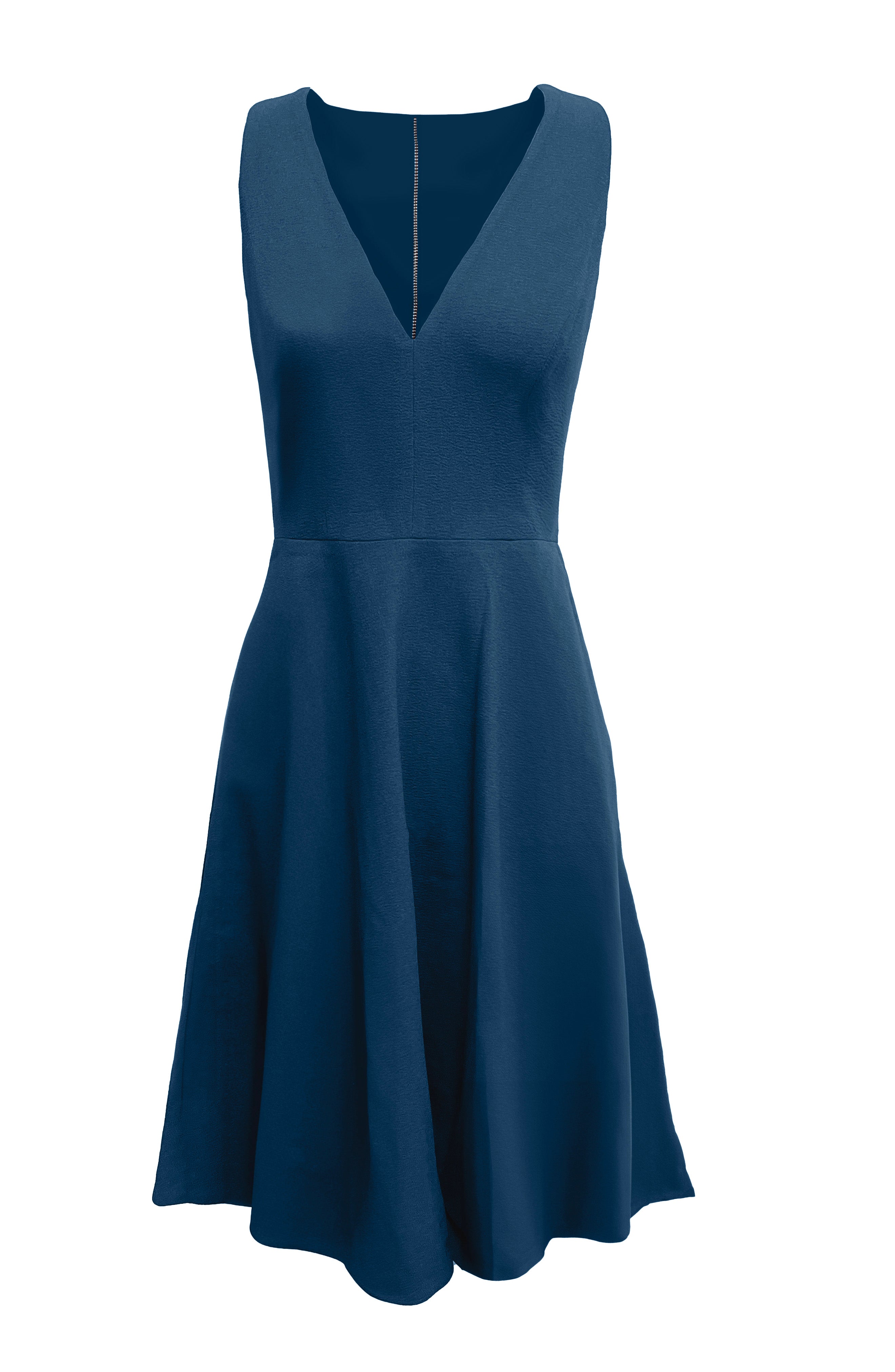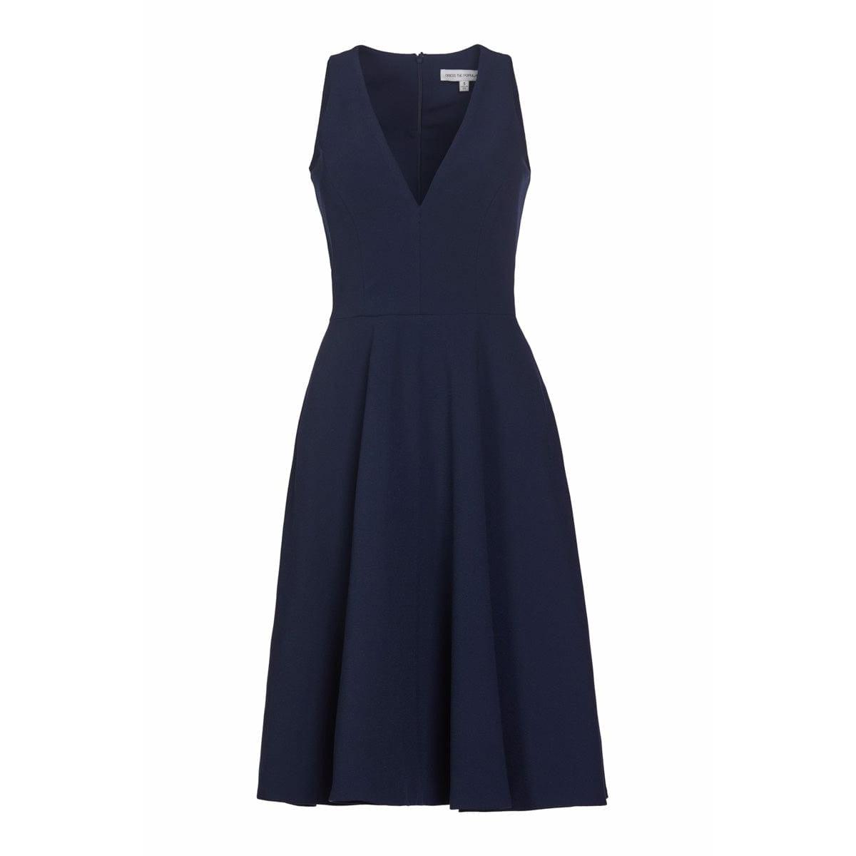 The Catalina is a crepe cocktail dress with a fit and flare silhouette and a v-neckline that flatters all body shapes. The bodice is fitted and tapers in to hug the waist, and the knee-length skirt is playful but polished. This sleeveless dress has wide straps and two side pockets.
