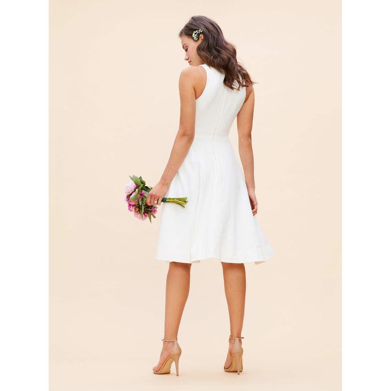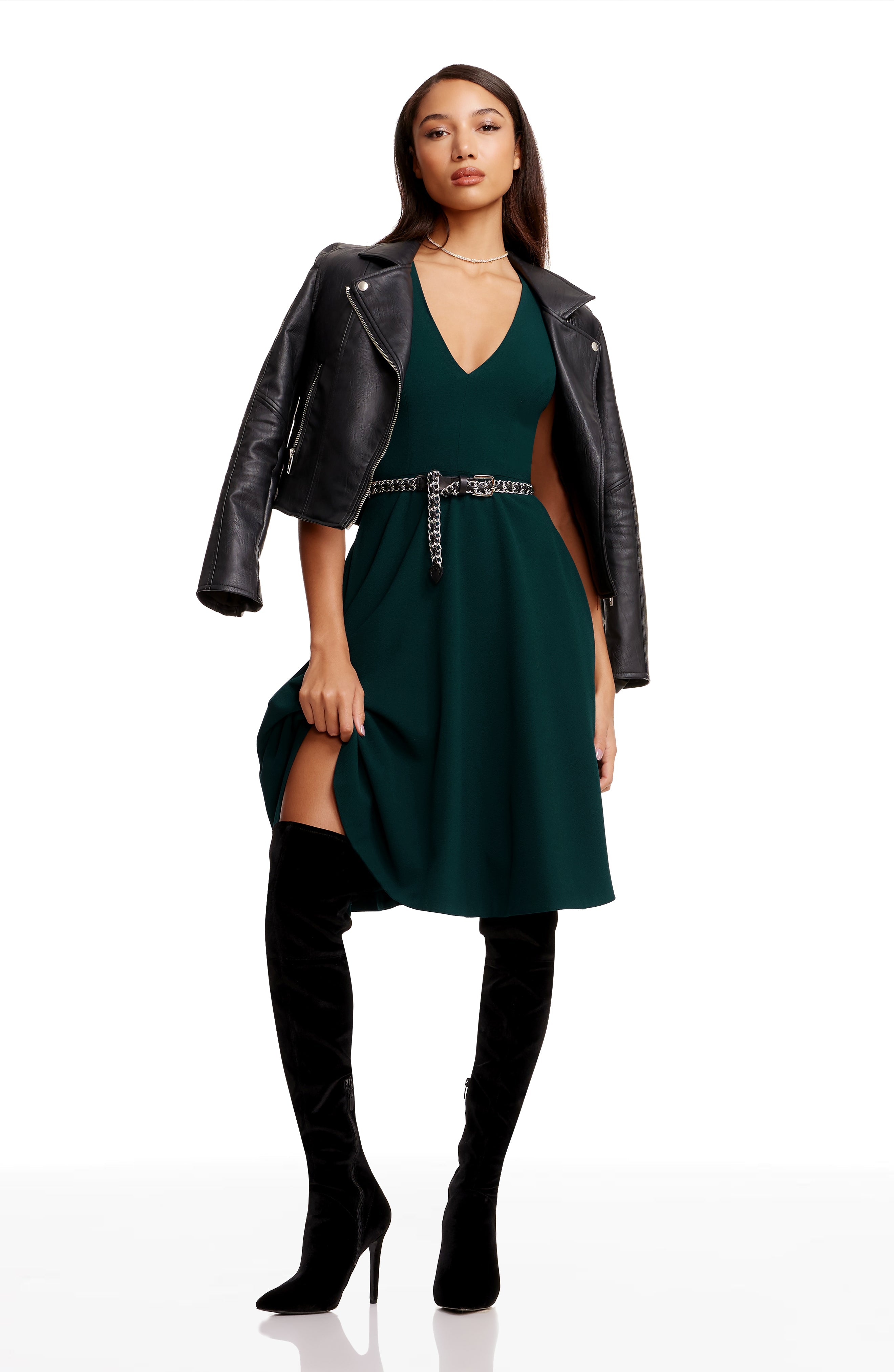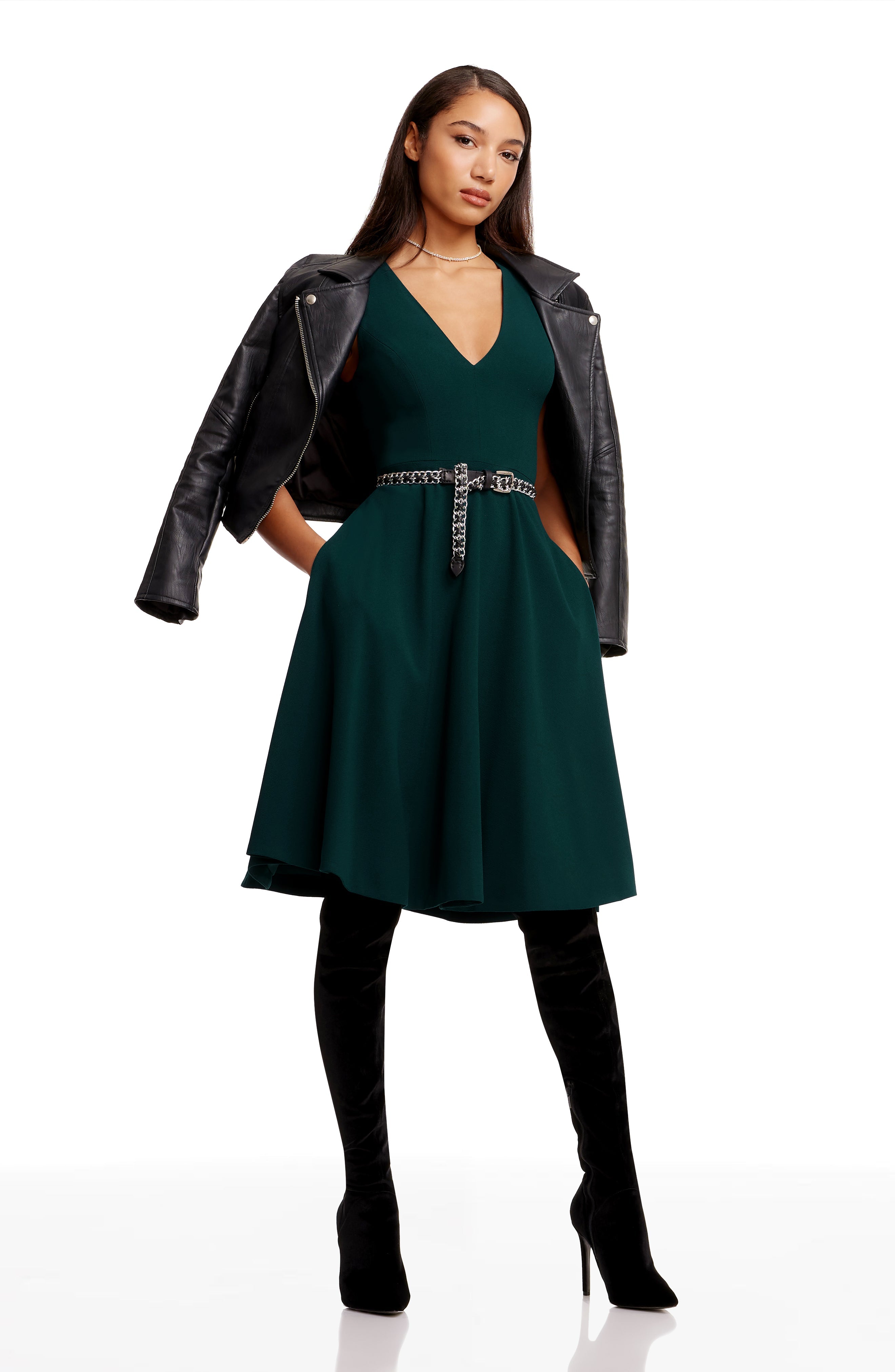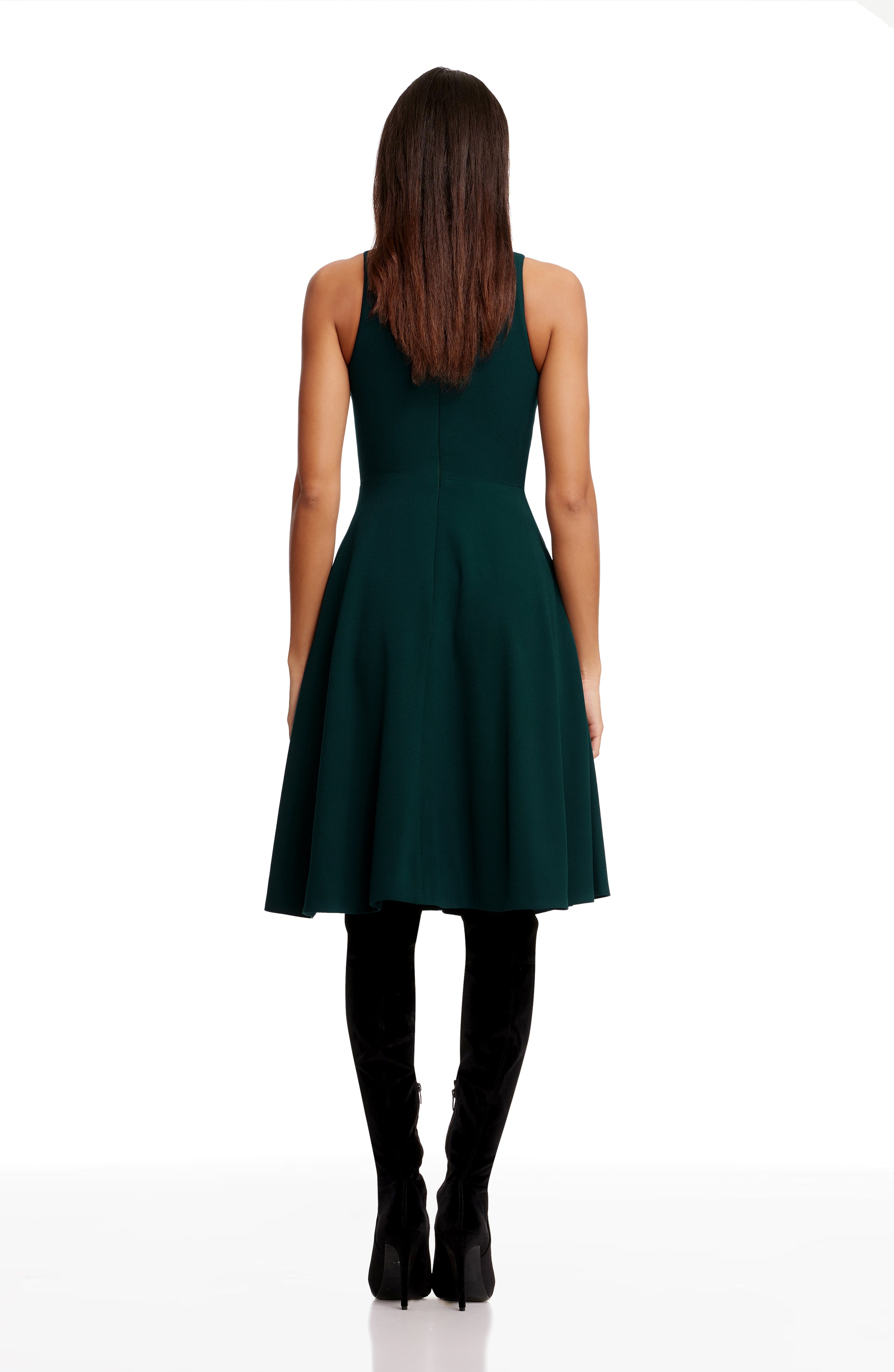 The Catalina is a crepe cocktail dress with a fit and flare silhouette and a v-neckline that flatters all body shapes. The bodice is fitted and tapers in to hug the waist, and the knee-length skirt is playful but polished. This sleeveless dress has wide straps and two side pockets.