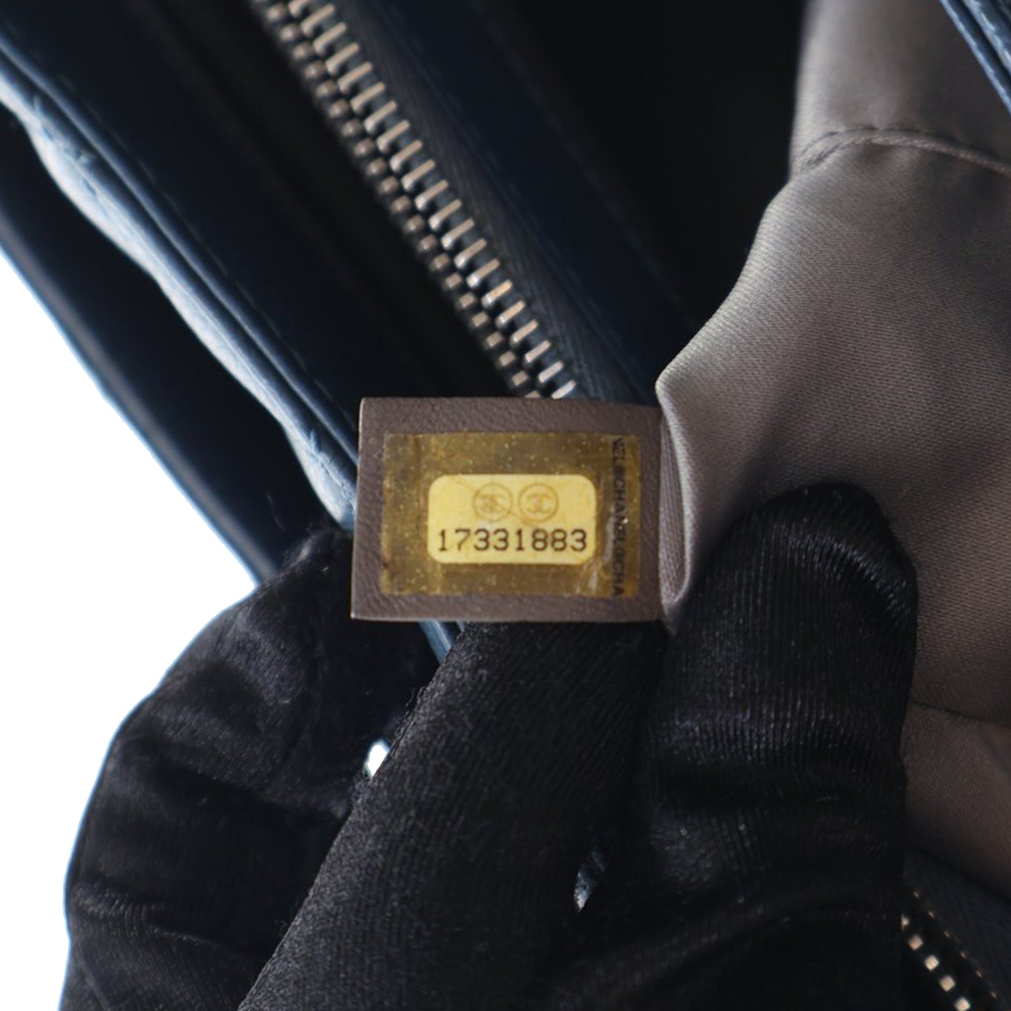 The Grand Shopping Tote features a caviar leather body, curb chain straps, an open top, an exterior back slip pocket, and interior zip and slip pockets.