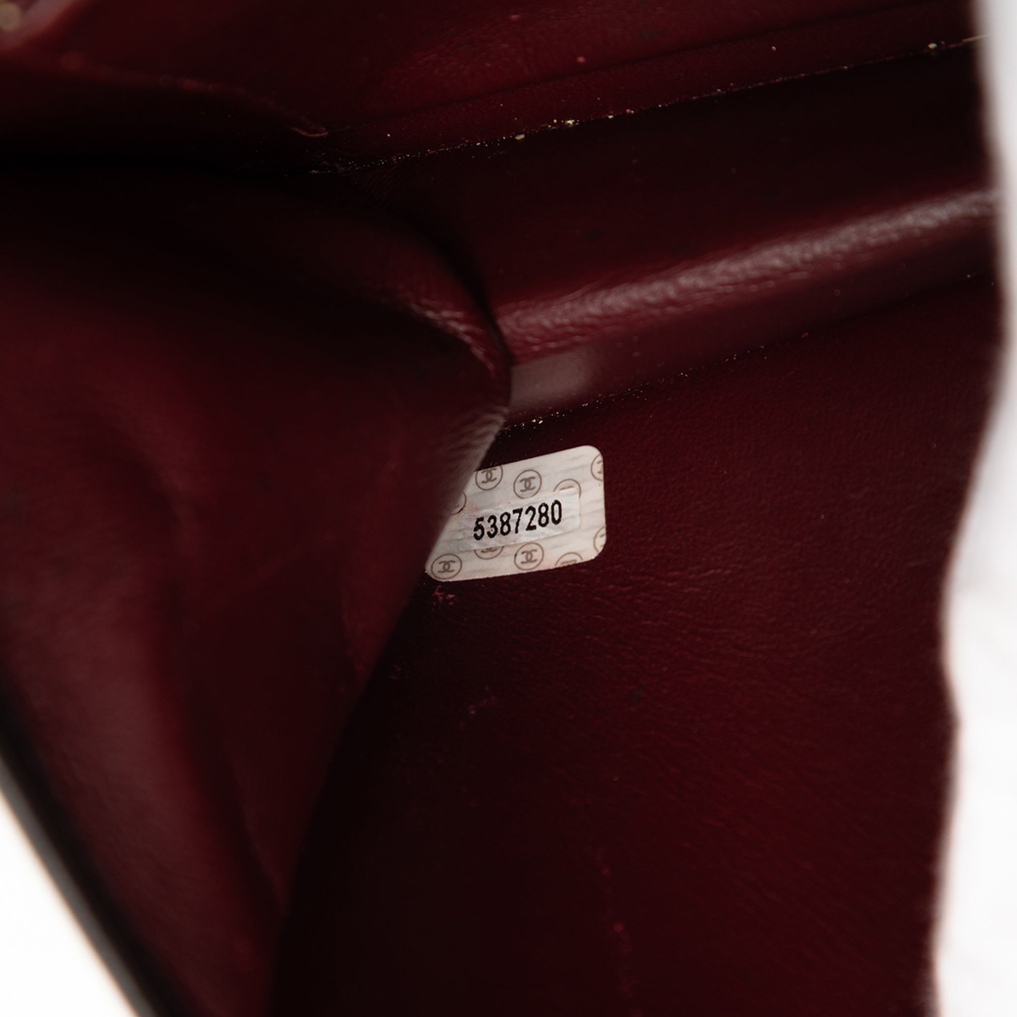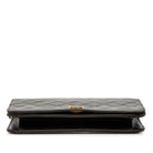 This crossbody bag features a quilted lambskin leather body, a leather-woven chain strap, a front flap with interlocking Cs and twist lock closure, and interior zip and slip pockets.