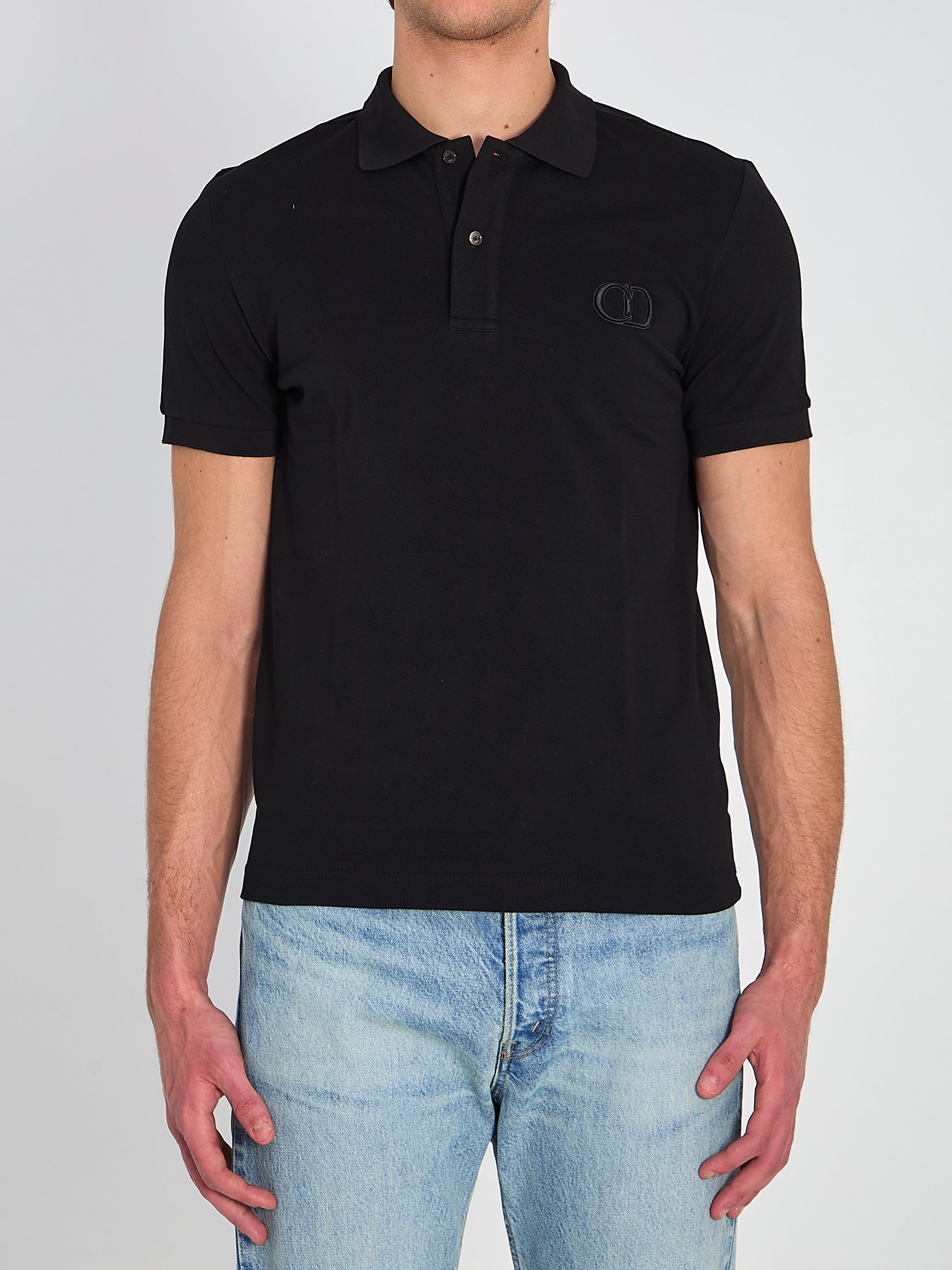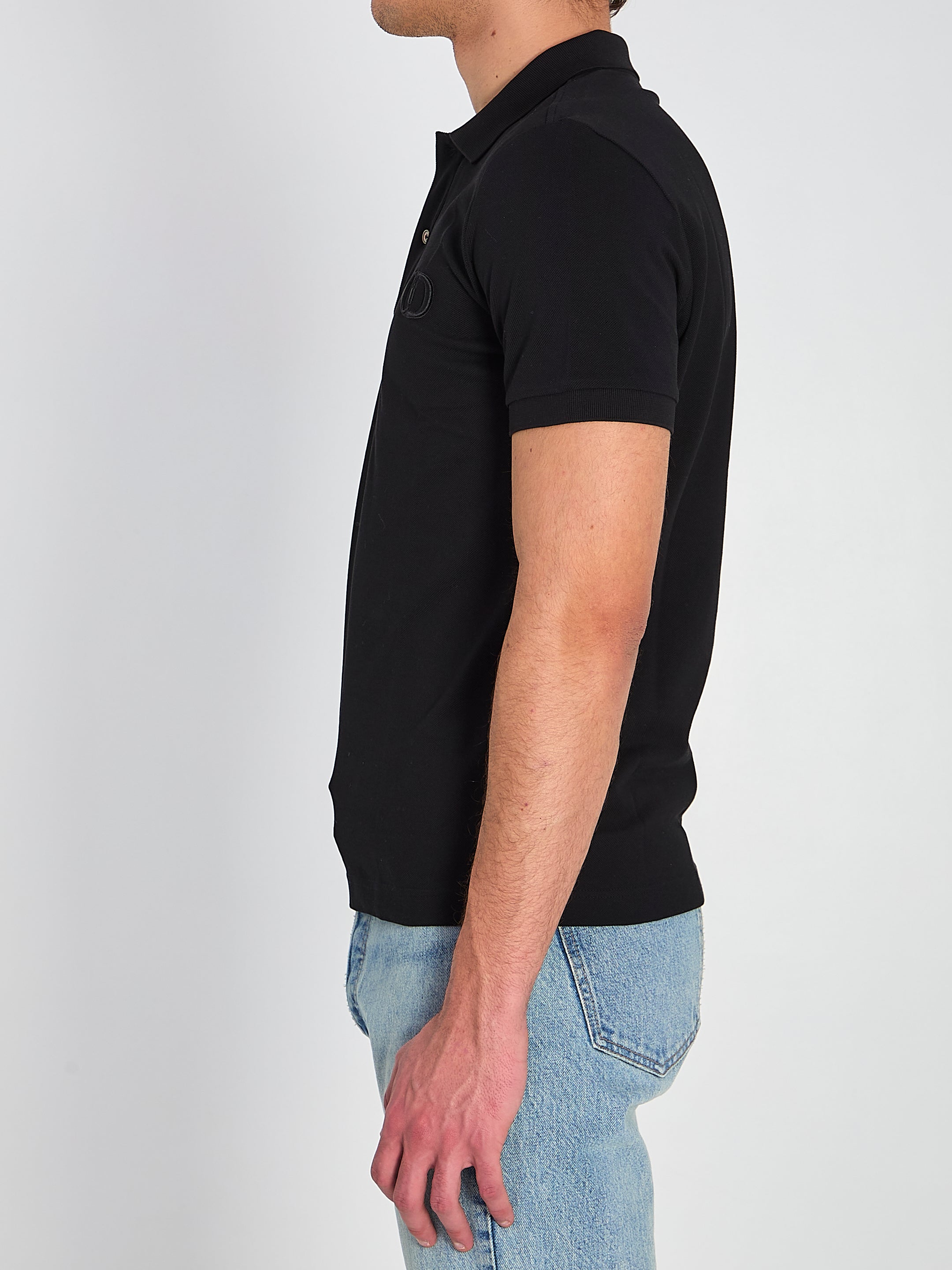 Polo in black cotton piqué. It features a polo-style collar, three-button front closure, short sleeves with ribbed cuffs, and a tone-on-tone CD Icon embroidery on the chest. Regular fit.