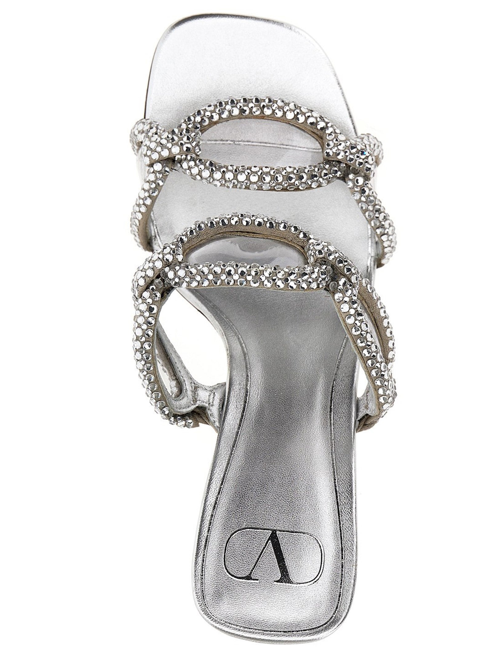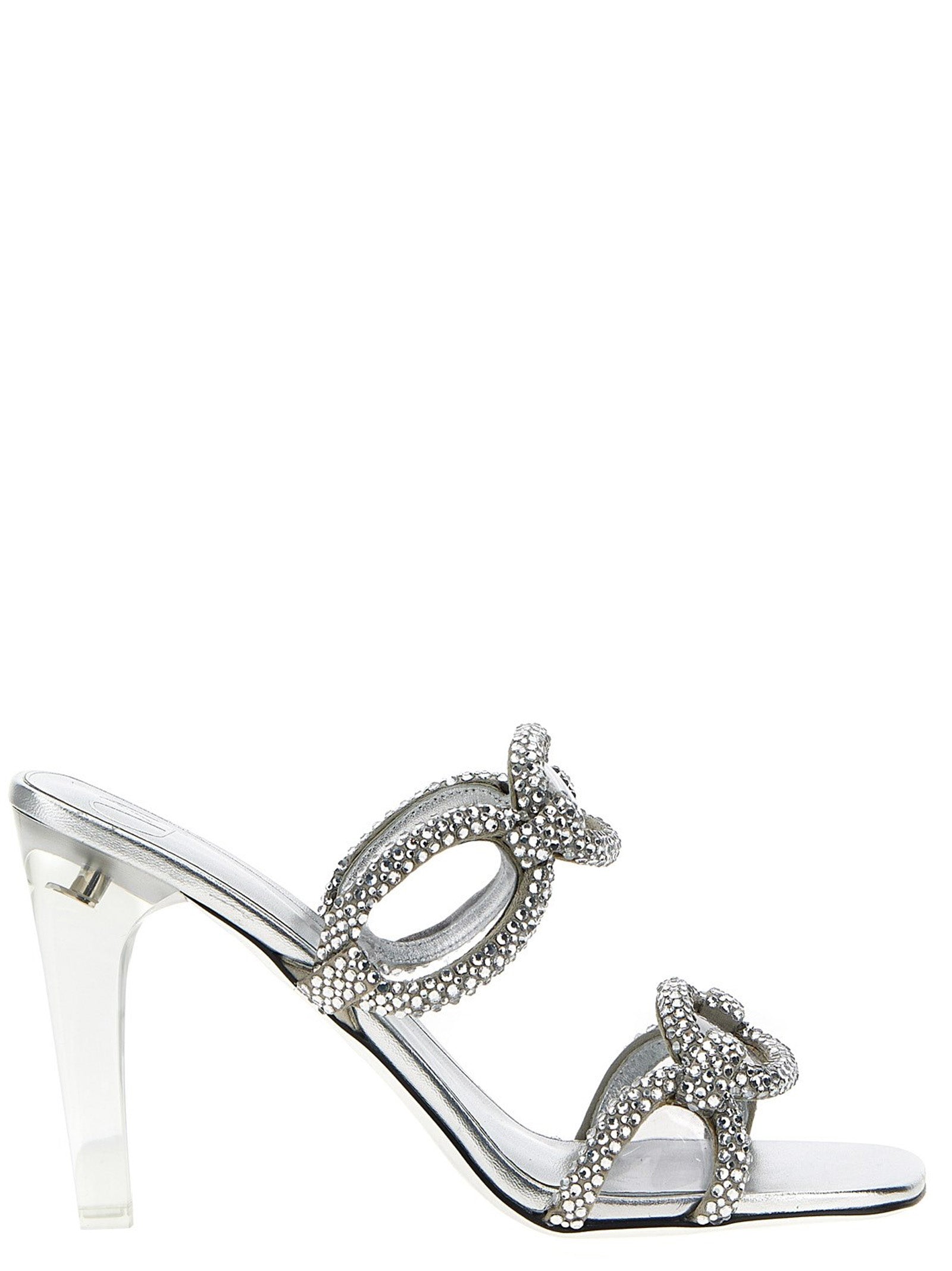 Elevate your evening ensemble with the stunning 'Chain 1967' sandals from Valentino Garavani. These luxurious heeled sandals feature an exquisite combination of laminated nappa leather and transparent synthetic materials, adorned with dazzling crystal appliqués that form an elegant 3D chain pattern.