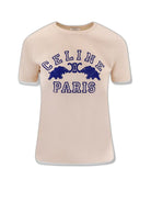 Elevate your casual wardrobe with this champagne-hued cotton t-shirt from Celine. Featuring the iconic "CELINE PARIS" graphic in rich blue lettering with decorative embellishments, this regular-fit tee effortlessly blends luxury with everyday comfort.